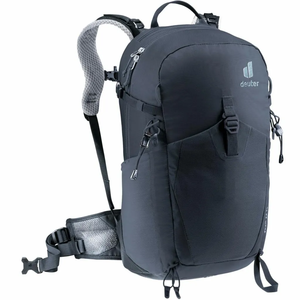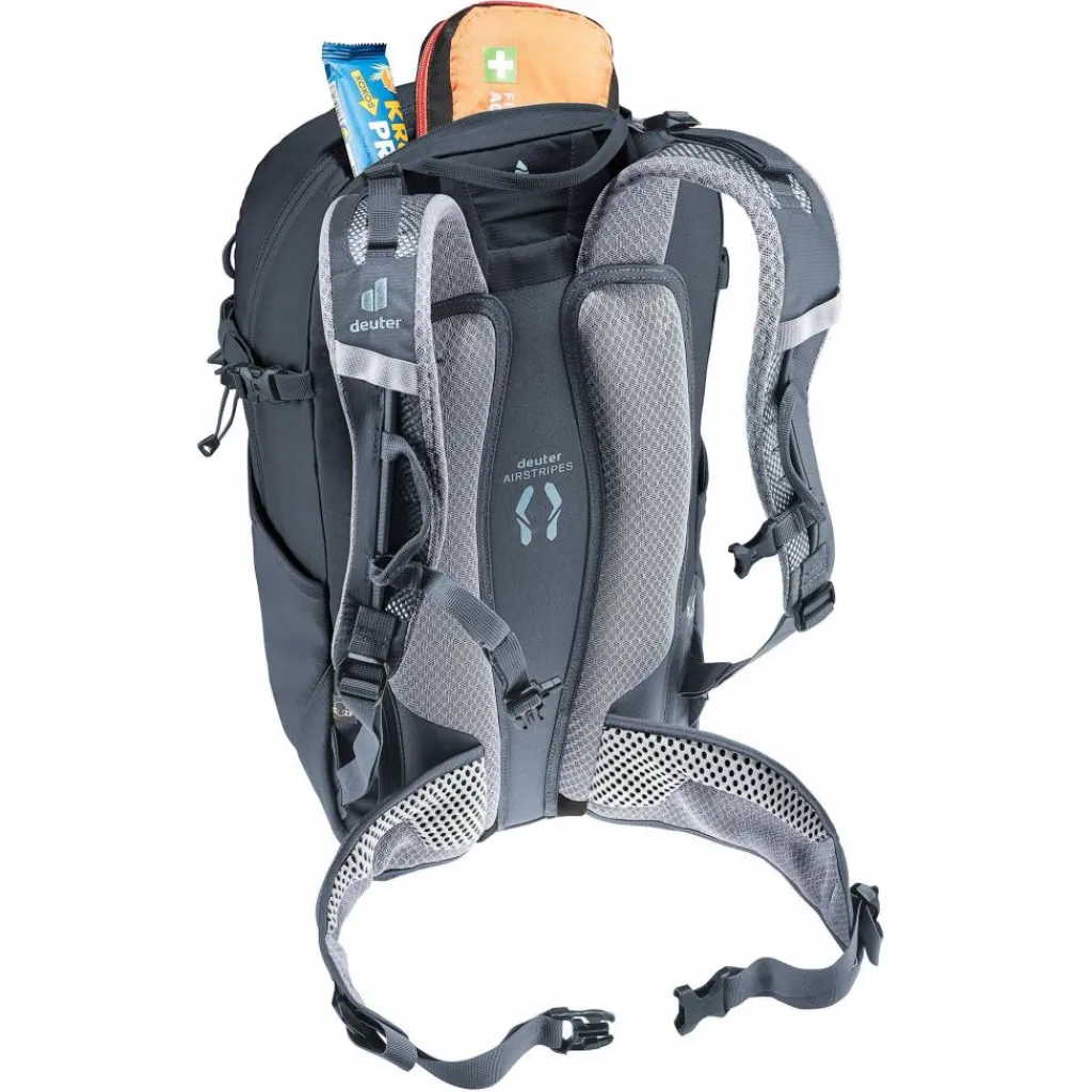 Das Airstripes Rückensystem mit geringer Rückenauflage und großen Belüftungskanälen sowie die perforierten Schulterträger und Hüftflossen sorgen für optimale Luftzirkulation, körpernahe Gewichtsverteilung und damit einen kompakten Sitz in jedem Terrain. Dank Fixierungen an den Schulterträgern sind die Karabiner des Klettersteigsets stets griffbereit. Zudem sind Ausrüstungsgegenstände und Material dank großer Rundbogenöffnung mit Reißverschluss, elastischer Frontstecktasche und Seitentaschen schnell zur Hand.