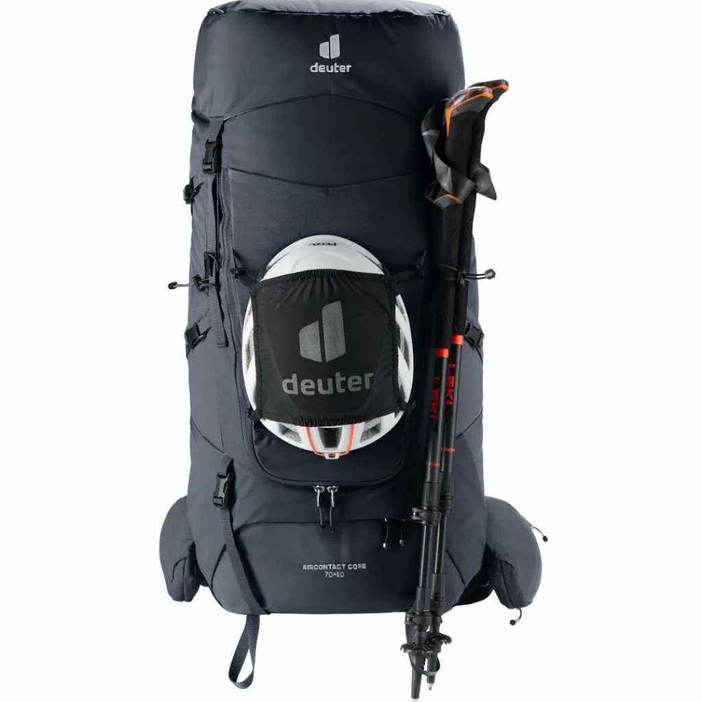 Der Trekkingrucksack wartet mit allen Fächern auf, die du auf Mehrtagestouren brauchst, um deine Ausrüstung übersichtlich und griffbereit zu sortieren. Das Hauptfach lässt sich klassisch von oben und über einen großen Frontzugang öffnen, sodass du jederzeit problemlos an deine komplette Ausrüstung kommst. Dank der Schlaufen auf der Front kannst du Zelt oder Isomatte einfach außen am Rucksack befestigen und so einiges an Platz im Hauptfach sparen. Den Aircontact Core musst du zum Trinken übrigens nicht absetzen: Mithilfe der Flaschenhalterung auf dem rechten Hüftgurt kannst du deinen Durst auch mit geschultertem Rucksack unkompliziert löschen.