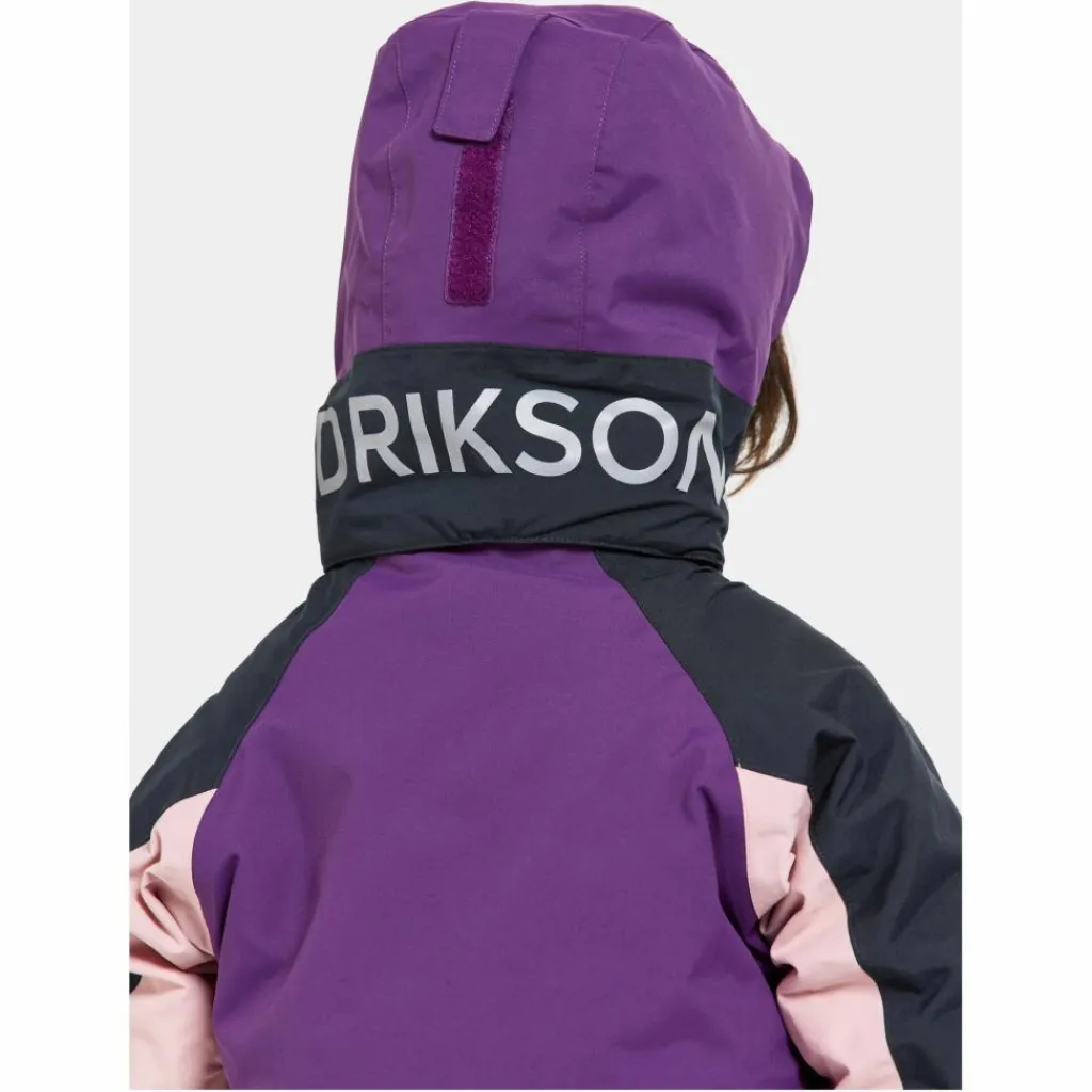 Die bequeme Passform mit vorgeformter Kniepartie lässt genügend Bewegungsspielraum zum Toben. Auf Taillenhöhe befindet sich ein Schnürzug, mit dem die Weite nach Wunsch angepasst werden kann. Vorne und hinten an den Beinen, an den Ärmeln und an der Kapuze verfügt der Schneeanzug über großflächige, reflektierende Designelemente. In einer der Einschubtaschen befindet sich außerdem eine Öse, an der ein Reflektor befestigt werden kann, ohne dass Löcher im Shellmaterial entstehen.