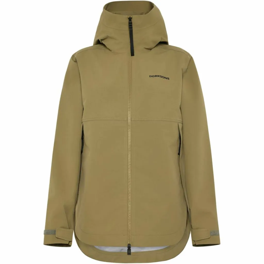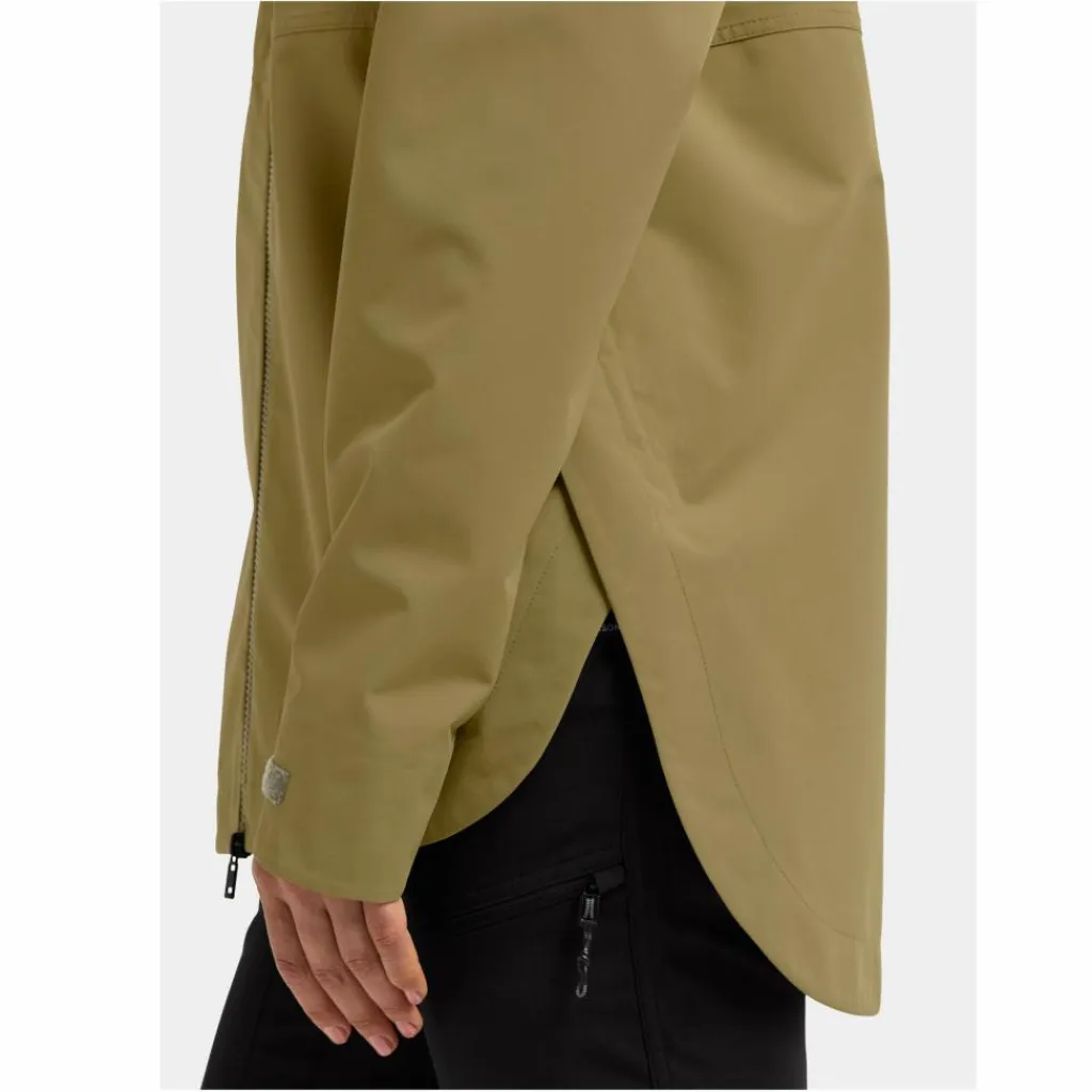 Den Zwei-Wege Front-Reißverschluss kannst du auch von unten öffnen, wenn du mehr Belüftung oder Bewegungsfreiheit benötigst. Du kannst den Reißverschluss auch offen lassen und nur die Knöpfe an der Windschutzleiste, die sich unter dem Reißverschluss befindet, schließen. So kommt mehr Luft in die Jacke, ohne dass sie vom Wind komplett aufgeweht werden kann. Die abgedeckten Taschen gehen Didriksons-typisch in die seitlichen Bewegungsschlitze über und sorgen so für einen stimmige, figurschmeichelnde Optik.