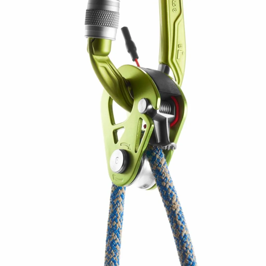 Die kugelgelagerte Umlenkrolle ist aus Aluminium gemacht. Damit die Klemmnocken jederzeit einen kräftigen Biss haben, auch an vereisten oder verschmutzten Seilstücken, sind sie mit einem Reinigungsschlitz ausgerüstet.
