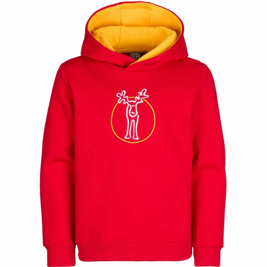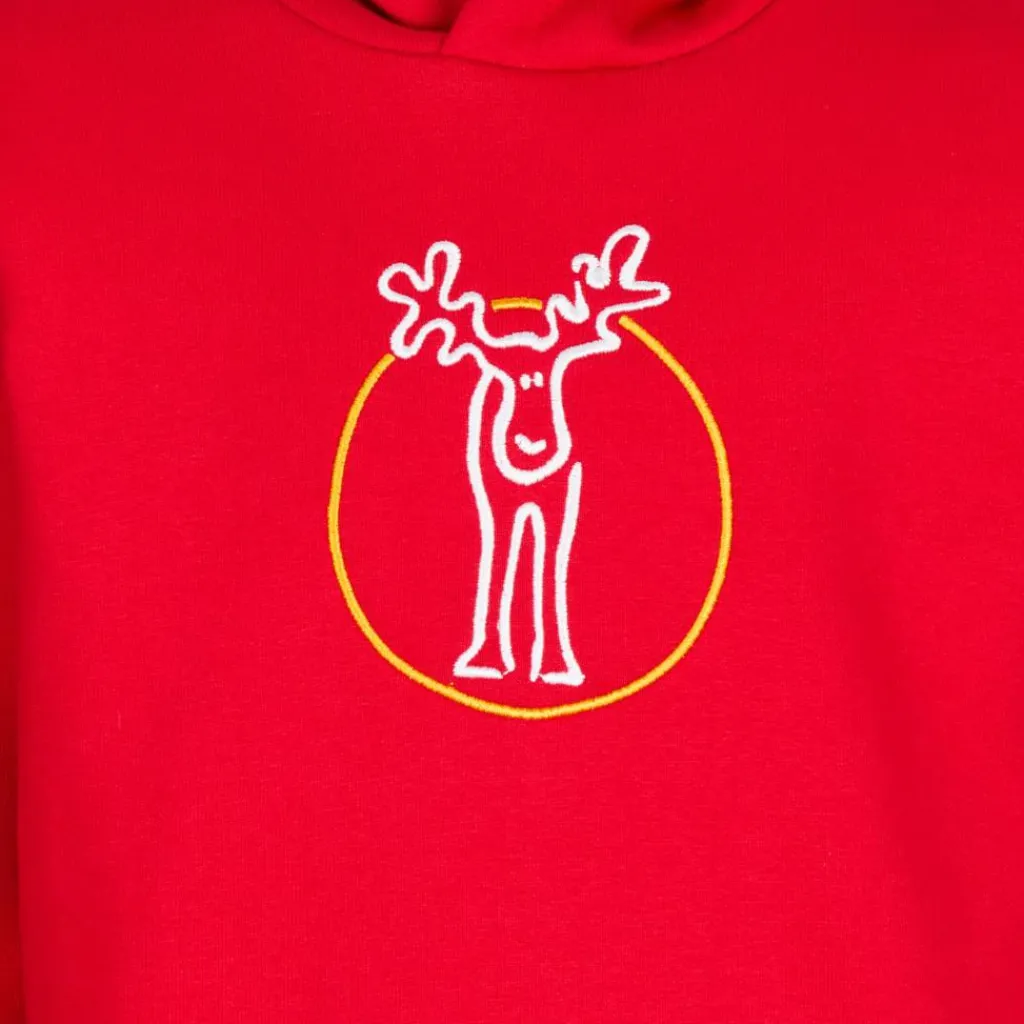 Gefertigt aus reiner Bio-Baumwolle liegt der Hoodie bequem auf der Haut. Das innen weich aufgebürstete Material erhöht den sehr angenehmen Tragekomfort. Rippstrick an den Ärmelabschlüssen und am Saum sorgen für bequemen Sitz. Wie es sich für einen Hoodie gehört, darf eine bequeme Kapuze – beim Taffchen in Kontrastfarbe – nicht fehlen. Vorne hat es sich zudem der süße Elch bereits bequem gemacht.