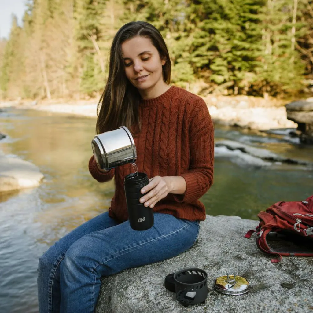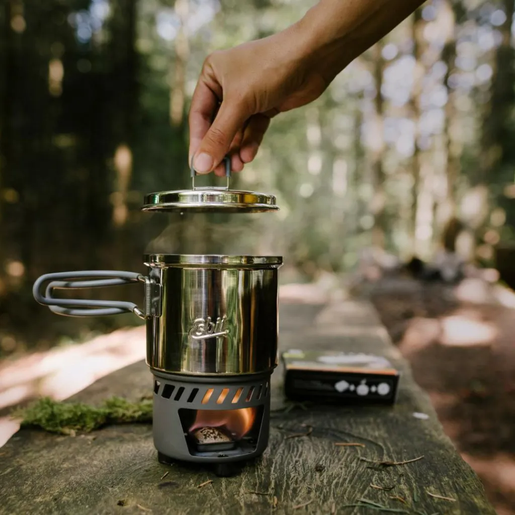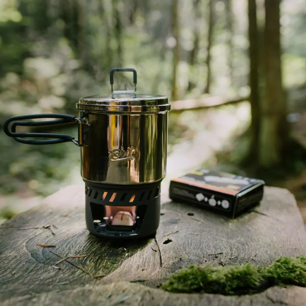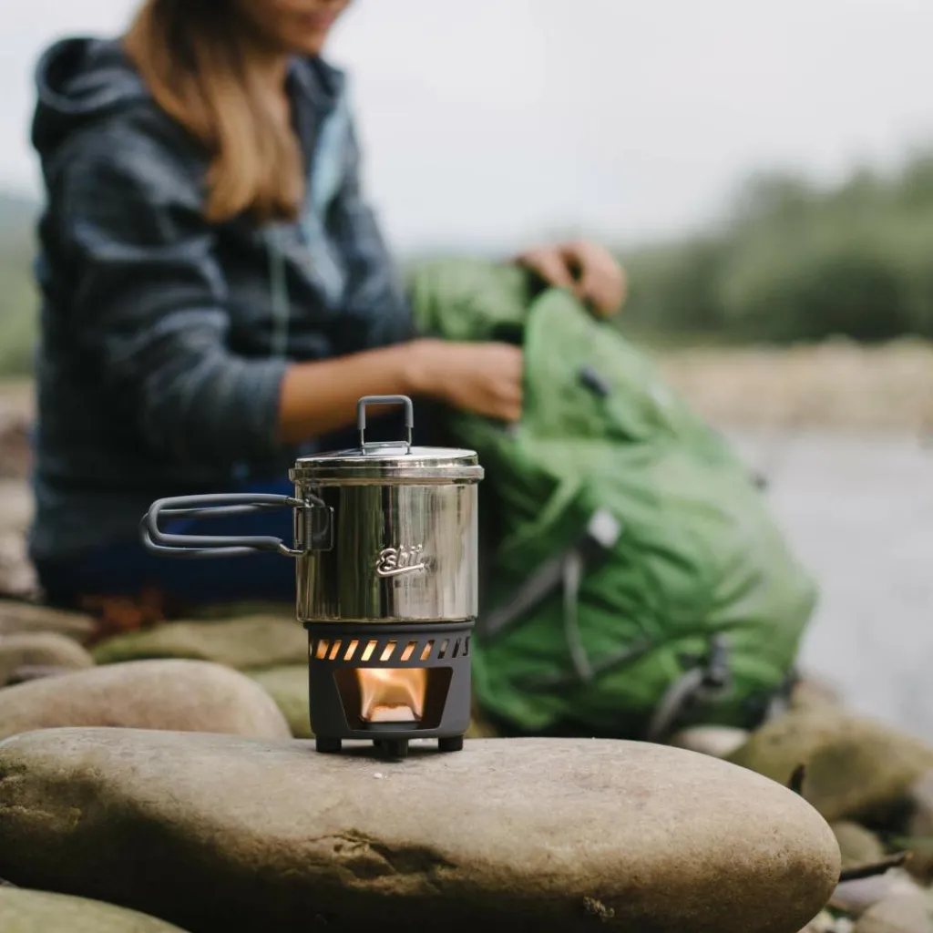 Das optimale Set für Ausflüge und Tageswanderungen! Das Trockenbrennstoff-Kochset besteht aus einem kleinen Edelstahltopf und Brennergestell für Esbit-Brennstoffwürfel.