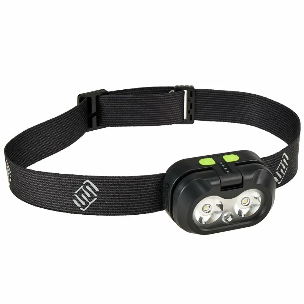 Der Lampenkopf ist aus recycelten Materialien gefertigt und lässt sich vertikal verstellen. Auf der Oberseite befinden sich der Ein-/Ausschalter und ein Modusknopf, mit dem du durch die verschiedenen Leuchtmodi schalten kannst. Schaltest du die Lampe aus und später wieder ein, startet sie im zuletzt verwendeten Leuchtmodus. Das elastische Stirnband ist mit reflektierenden Aufdrucken versehen und kann vom Lampenkopf abgenommen und bei Bedarf gewaschen werden.
