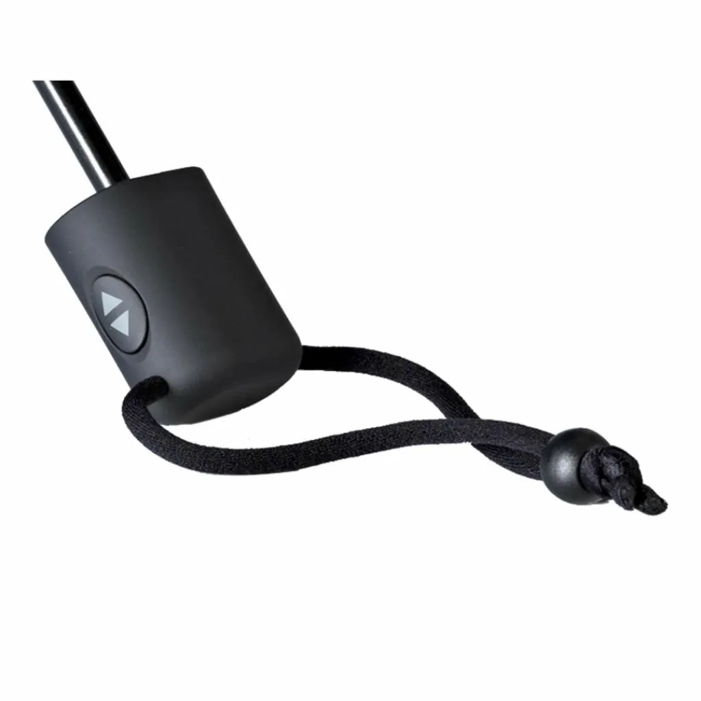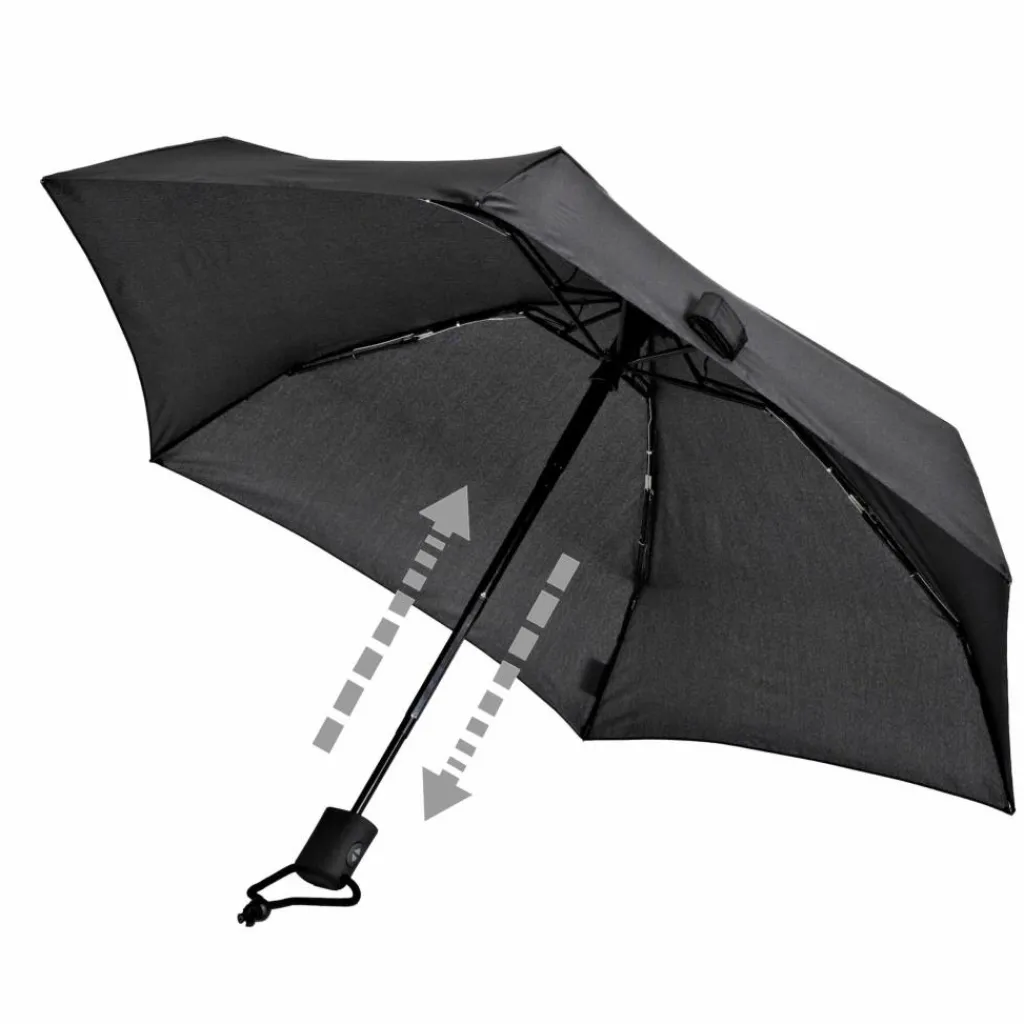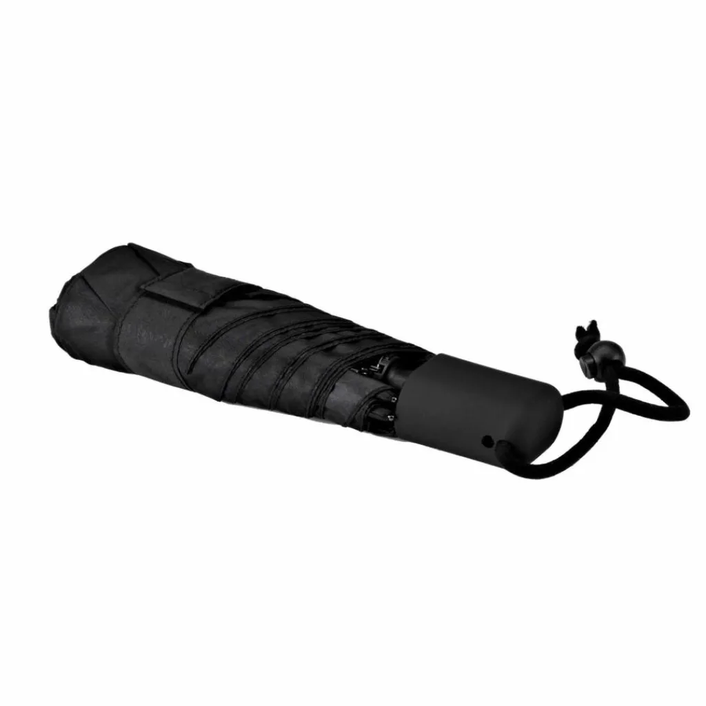 Ein flacher (!), stabiler Automatikregenschirm mit Fixierschlaufe und Karabiner. Federleicht, klein verpackbar, aber besitzt aufgespannt trotzdem einen Durchmesser von 93 cm.