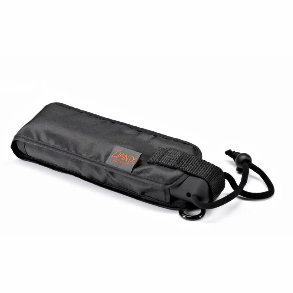 Auch die Nylon-Packtasche verdient einen extra Blick. So lässt sich der Schirm dank der Fixierschlaufe und des Karabiners bei Nichtgebrauch einfach an den Gürtel oder den Rucksack hängen. So ist der Dainty automatic immer griffbereit.