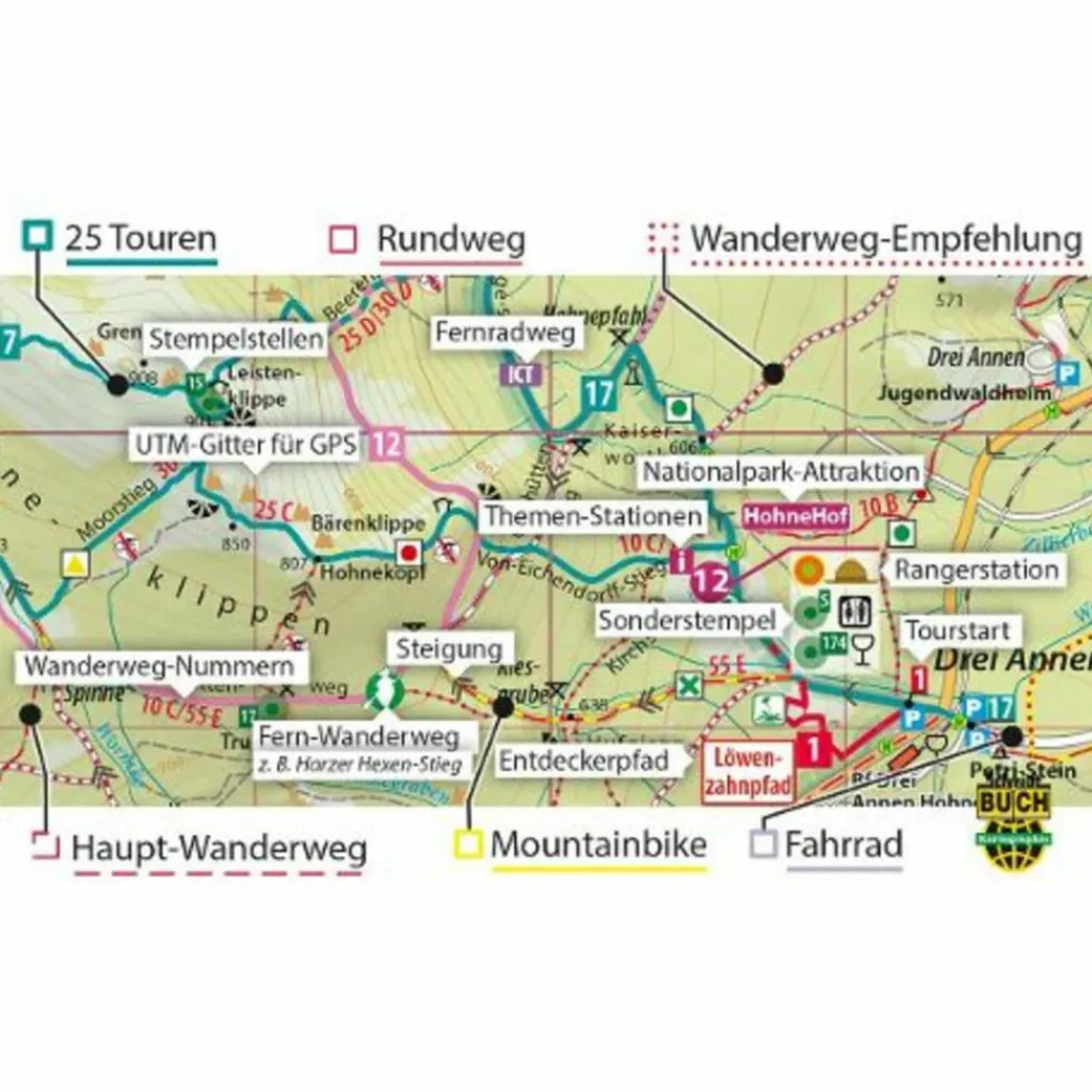Kartografische Ausstattung – Maßstab 1 : 30 000 – Höhenlinien in 20-Meter-Schritten und Gelände-Schummerung – UTM-Gitter für GPS – Harzklub-Wanderwege in offizieller Markierung und Nummerierung – Thematische Harz-Fernwanderwege – Ausgeschilderte MTB-Wege und Mountainbike-Empfehlungen (teilweise mit Single-Trail-Skala) – Mit Wandernadel-Stempelstellen und Nummern – Kartografie-Symbole (Schutzhütten, Rast- und Grillplätze, Aussichtspunkte, Camping- bzw. Wohnmobilstellplätze sowie Jugendherbergen und vieles mehr) -Signaturen zu Kultur und Freizeit (Sehenswürdigkeiten, Schwimmhallen und Freibäder, Golf- und Tennisplätze, Kletter- und Bikeparks, Reitmöglichkeiten, Skilifte, Skiabfahrten und Rodelbahnen)