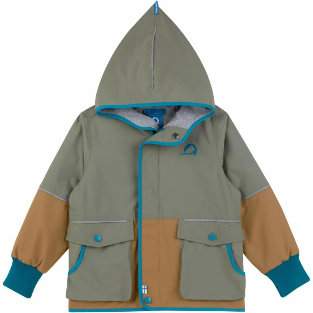 Die niedliche Zipfelkapuze (ab Gr. 120/130 ist die Kapuze rund) sorgt für zusätzlichen Schutz vor Nässe und kühlem Wind. Die breiten Rippstrick-Bündchen schließen gut ab und in den großen Taschen lässt sich jede Menge Strandgut verstauen. Der gerade Schnitt lässt viel Bewegungsfreiheit fürs Klettern und Toben. Und mit ihren harmonischen Farbkontrasten und ihrem Finkid-typischen Design hat die Jacke echten Wiedererkennungswert.