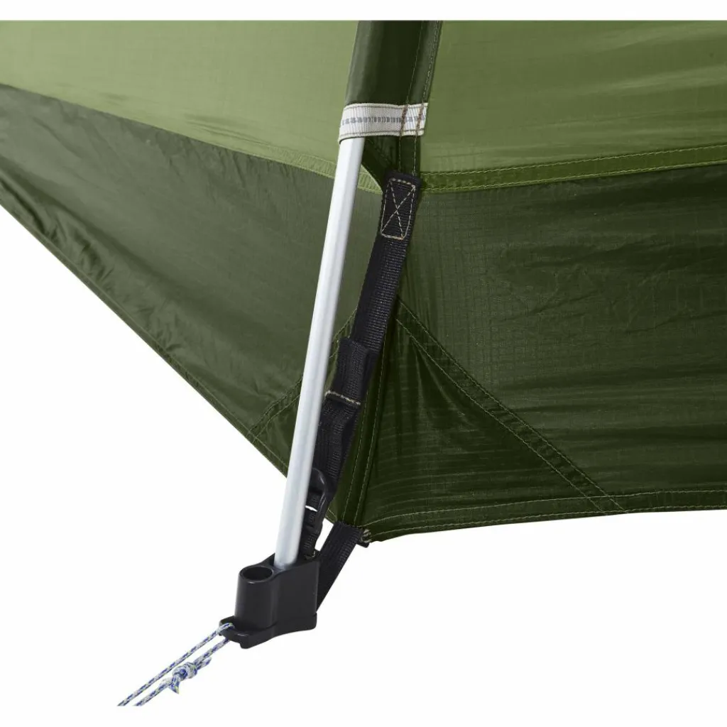 Das Kuppelzelt besitzt zwei Zelteingänge und zwei große Apsiden. Das ermöglicht nicht nur den bequemen Ein- und Ausstieg zur windabgewandten Seite, sondern vereinfacht auch den Zeltalltag, da jede Seite separat organisiert werden kann. Ein voluminöser Trekkingrucksack passt hier problemlos in die Apsis.