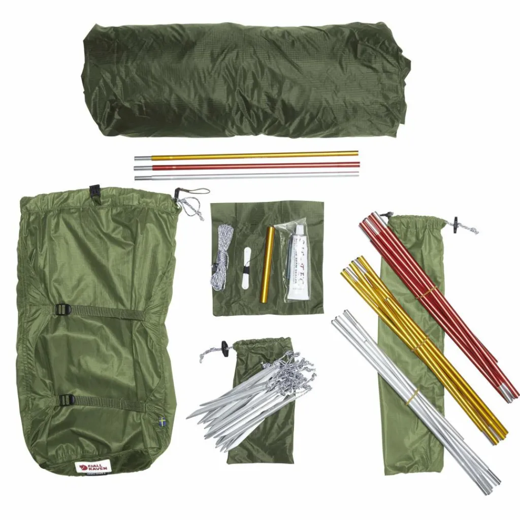 Abisko Shape 3, Gestänge, Heringe, Abspannleinen, Packsack, Reparaturhülse, Ersatzgestängesegmente (rot, gelb und silber), Nähnadel & Faden, Ersatzzeltleine, Klebeflicken, Stoffstücke zur Reparatur (eines für jeden verarbeiteten Stoff), Anleitung