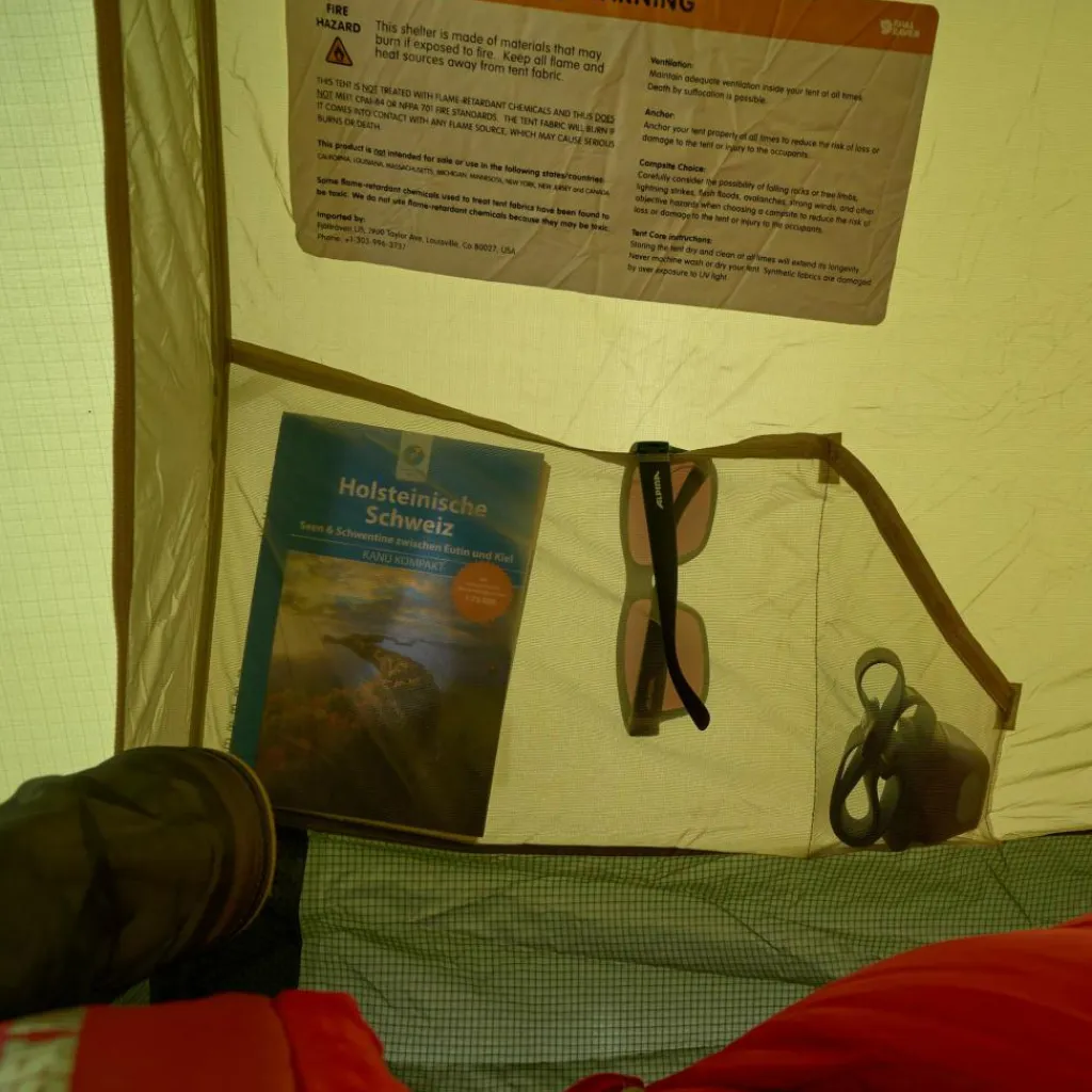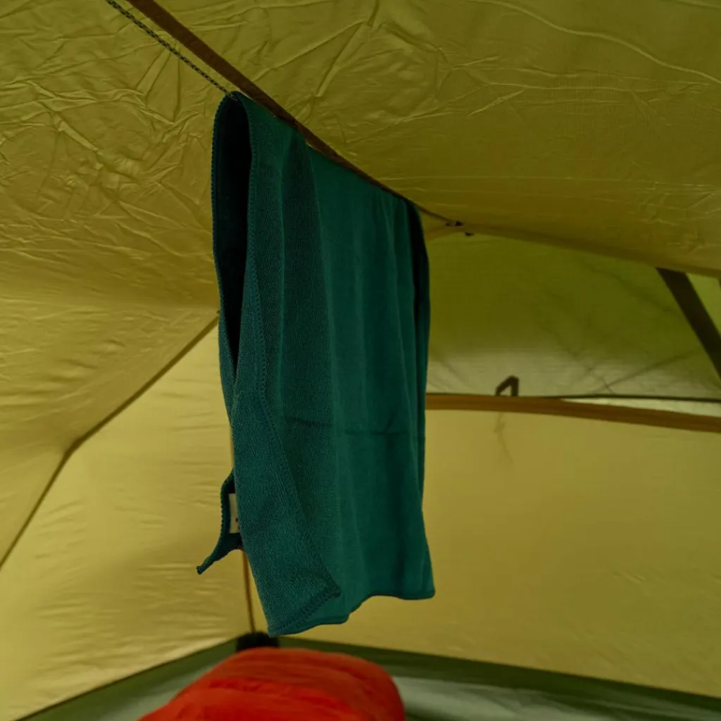 Auch die Details überzeugen. So verfügt das Abisko Endurance über eine Wäscheleine in der Apsis und im Innenraum, auf der du feuchte Ausrüstungsgegenstände über Nacht trocknen kannst. Für Ordnung im Innenzelt sorgen mehrere Netztaschen.