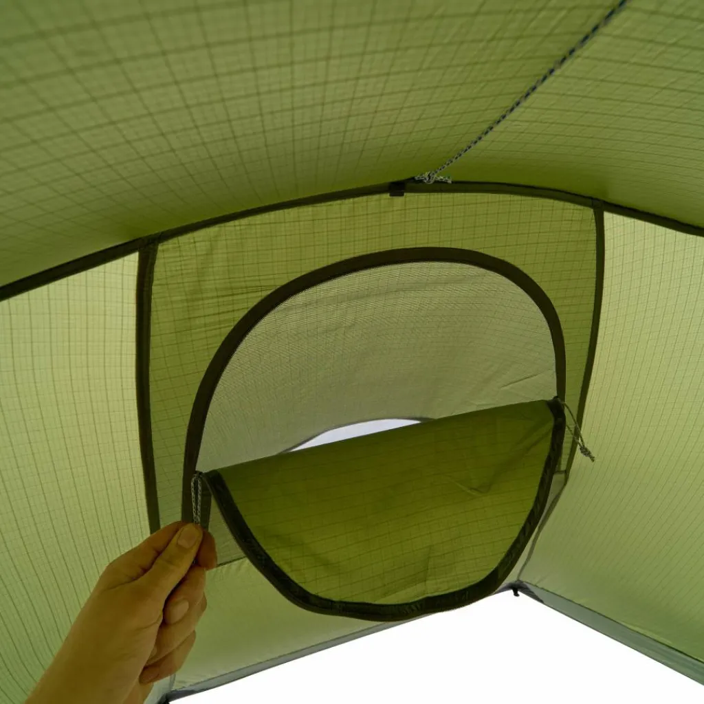 Die großen Lüfter sind hoch angebracht und besitzen ein feinmaschiges Moskitonetz, das selbst kleinste Insekten fernhält. Besonders in warmen Nächten wirst du dich aber über die zusätzliche Belüftungsfunktion der Eingangstür freuen. Sie kann in halb geöffneter Position fixiert werden und sorgt anschließend für maximale Belüftung im Zelt. Eine Auto-Stopp-Funktion verhindert dabei, dass sich der Reißverschluss weiter öffnen kann.