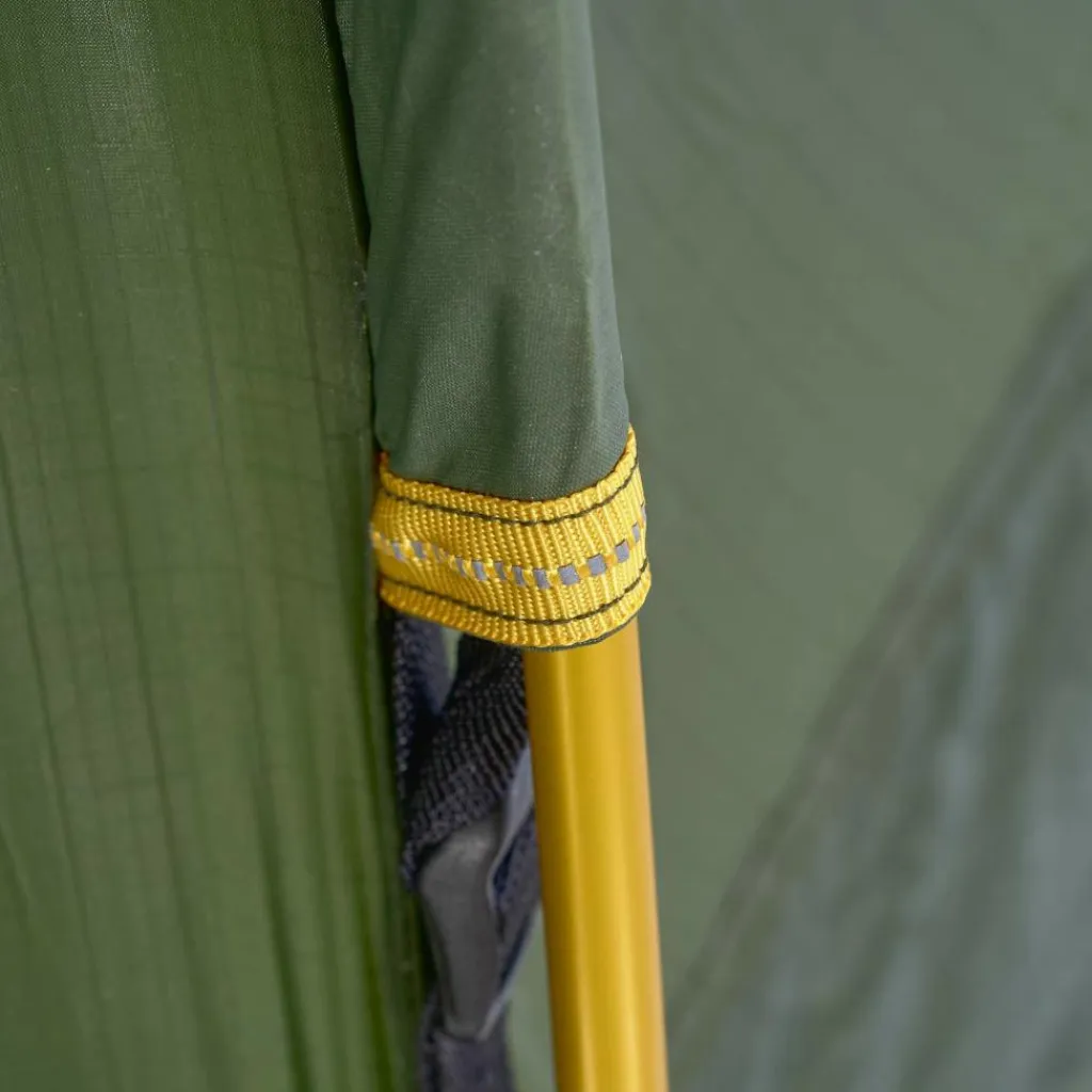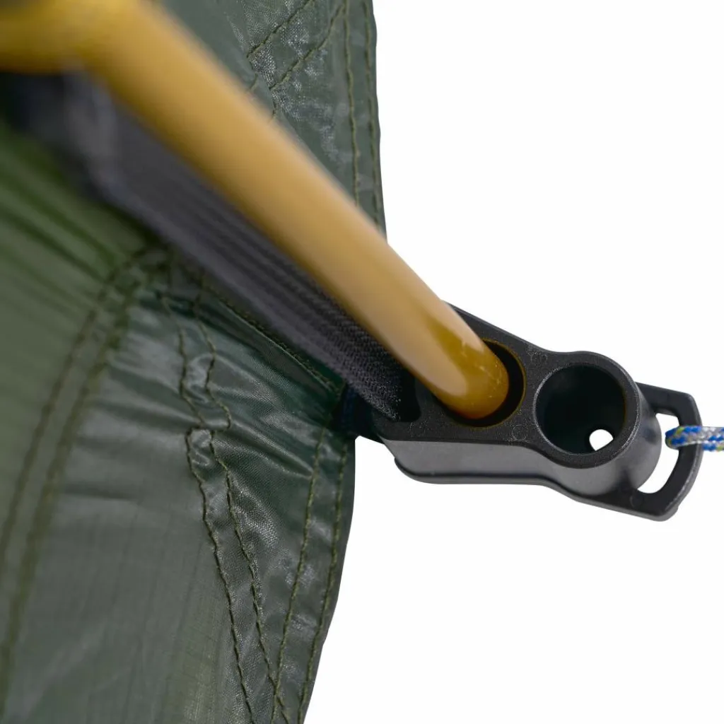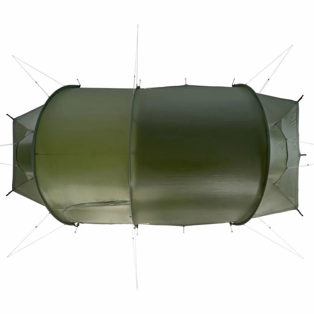 Das Innen- und Außenzelt kann gleichzeitig aufgestellt werden. So bleibt das Innenzelt bei Regen trocken und die Aufbauzeit wird verkürzt. Alle Gestängekanäle sind farblich markiert und so bemessen, dass bei starkem Sturm oder viel Schnee ein zweiter Stangensatz (als Zubehör erhältlich) eingezogen werden kann.