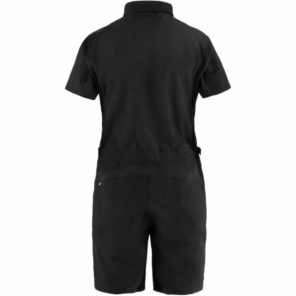 Die Taille kannst du passgenau mit zwei Riemen an den Seiten einstellen. Ein langer 2-Wege-Front-RV macht den Ein- und Ausstieg in den Einteiler und kühlendes Lüften schön einfach. Sinnvolles Detail: Wenn du den Saum der Hosenbeine umschlägst, kommen reflektierende Elemente zum Vorschein.