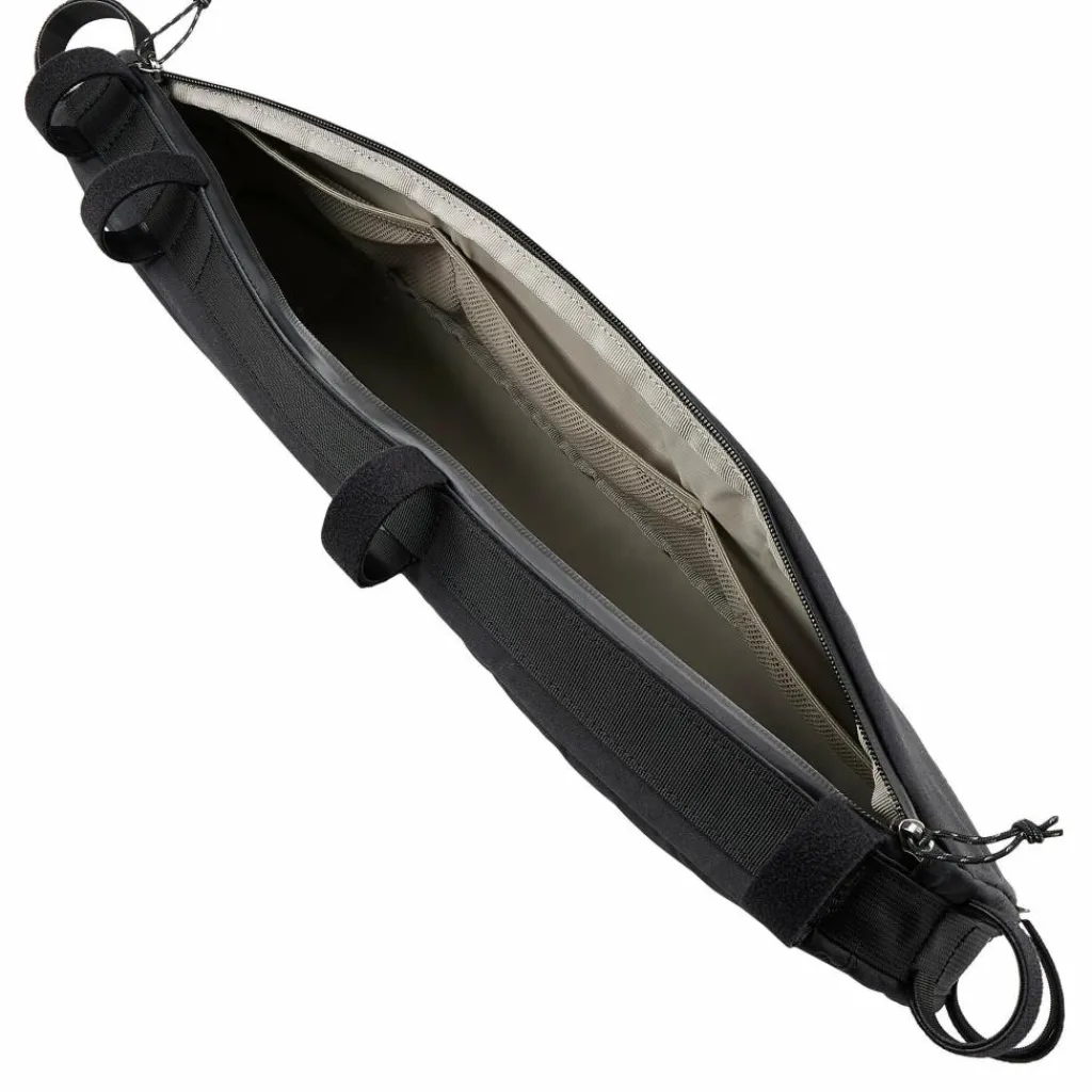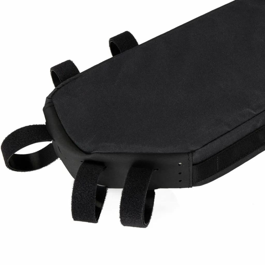 Die Hoja Frame Bag L hat einen langen RV, der hinten auch „ums Eck“ geht. Dadurch kannst du die Rahmentasche schön weit öffnen und kommst an den Inhalt sehr gut heran. Durch die Lage im Zentrum deines Fahrrades lassen sich hier gut schwere Ausrüstungsgegenstände unterbringen. Dank der sieben Klettlaschen kannst du die Hoja Frame Bag L sicher im Fahrradrahmen fixieren.