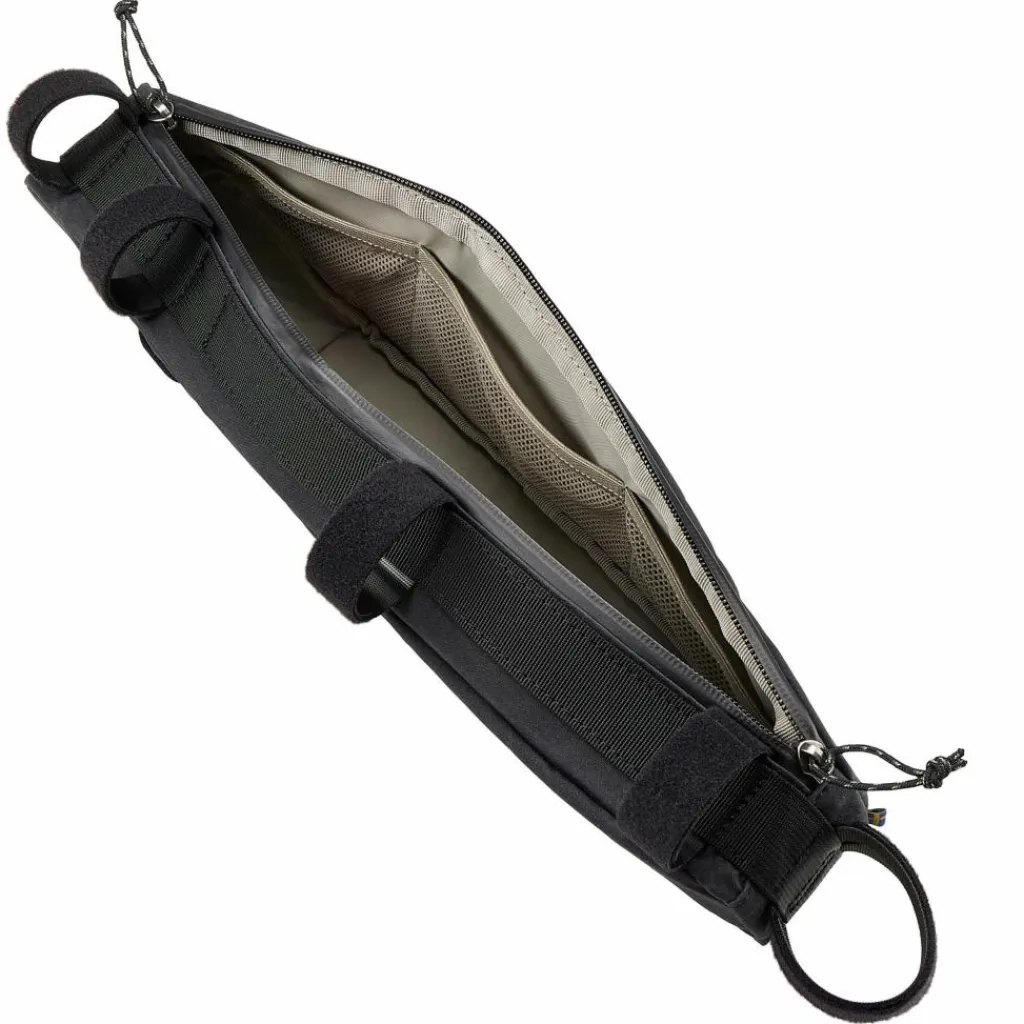 Die Hoja Frame Bag S hat einen langen RV, der hinten auch „ums Eck“ geht. Dadurch kannst du die Rahmentasche schön weit öffnen und kommst an den Inhalt sehr gut heran. Durch die Lage im Zentrum deines Fahrrades lassen sich hier gut schwere Ausrüstungsgegenstände unterbringen. Dank der sieben Klettlaschen kannst du die Hoja Frame Bag S sicher im Fahrradrahmen fixieren.