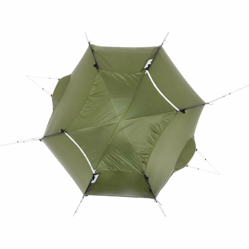 Das Außenzelt ist freistehend. Es sind bei milder Witterung also keine Heringe zum Aufbau notwendig und das Zelt kann beliebig oft umgestellt werden, bis ein geeigneter Standplatz gefunden ist. Falls die reflektierenden Abspannleinen doch benötigt werden, so lässt sich das Keb Dome durch Einsatz der langen Leinen und Doppelspannern selbst mit vergrabenen Skiern oder Schneeschuhen abspannen.