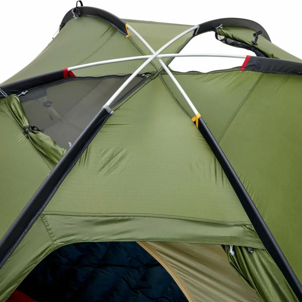 Die Außenzelttüren kannst du halb geöffnet fixieren. Das maximiert die Belüftung, ohne dass Regen ins Innenzelt tropfen kann. Die beiden großen Tieflüfter kannst du aus dem Innenzelt heraus bedienen. Sie sind mit feinem Moskitonetz versehen. Ergänzt werden sie durch zwei Deckenlüfter, für deren Bedienung du das Zelt ebenfalls nicht verlassen musst. Alle Lüfter können schneesicher verschlossen werden.