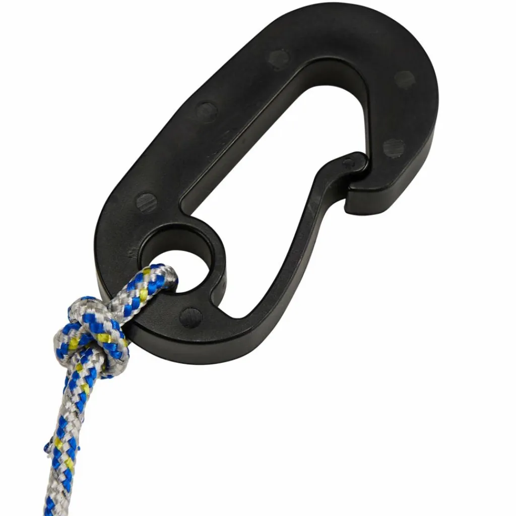 Mit einer starken Schnur mit Kunststoffkarabiner versehen, der in die Sturmleine des Zelts eingehakt werden kann, bietet der Hering festen Halt in lockerem Untergrund. Die Löcher im Hering ermöglichen unterschiedliche Befestigungsmöglichkeiten der Schnur und reduzieren das Gewicht.