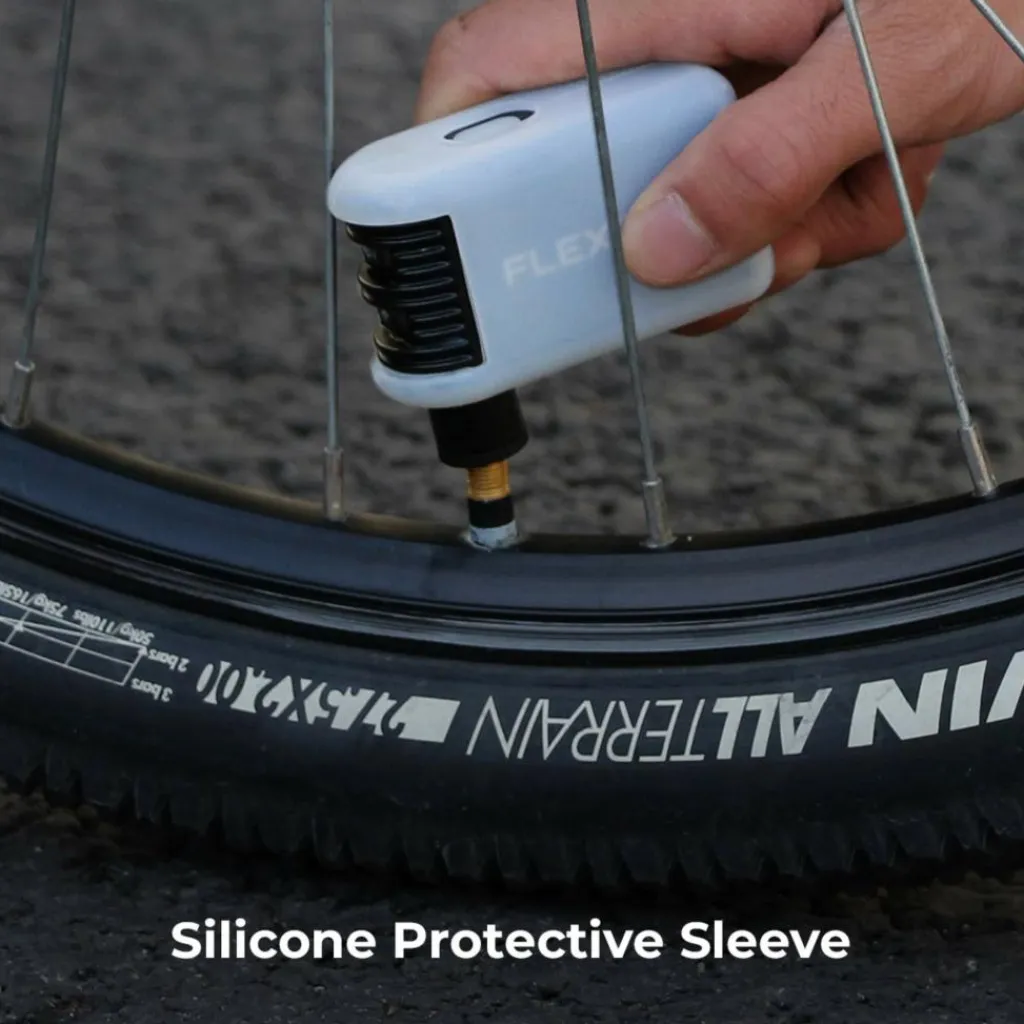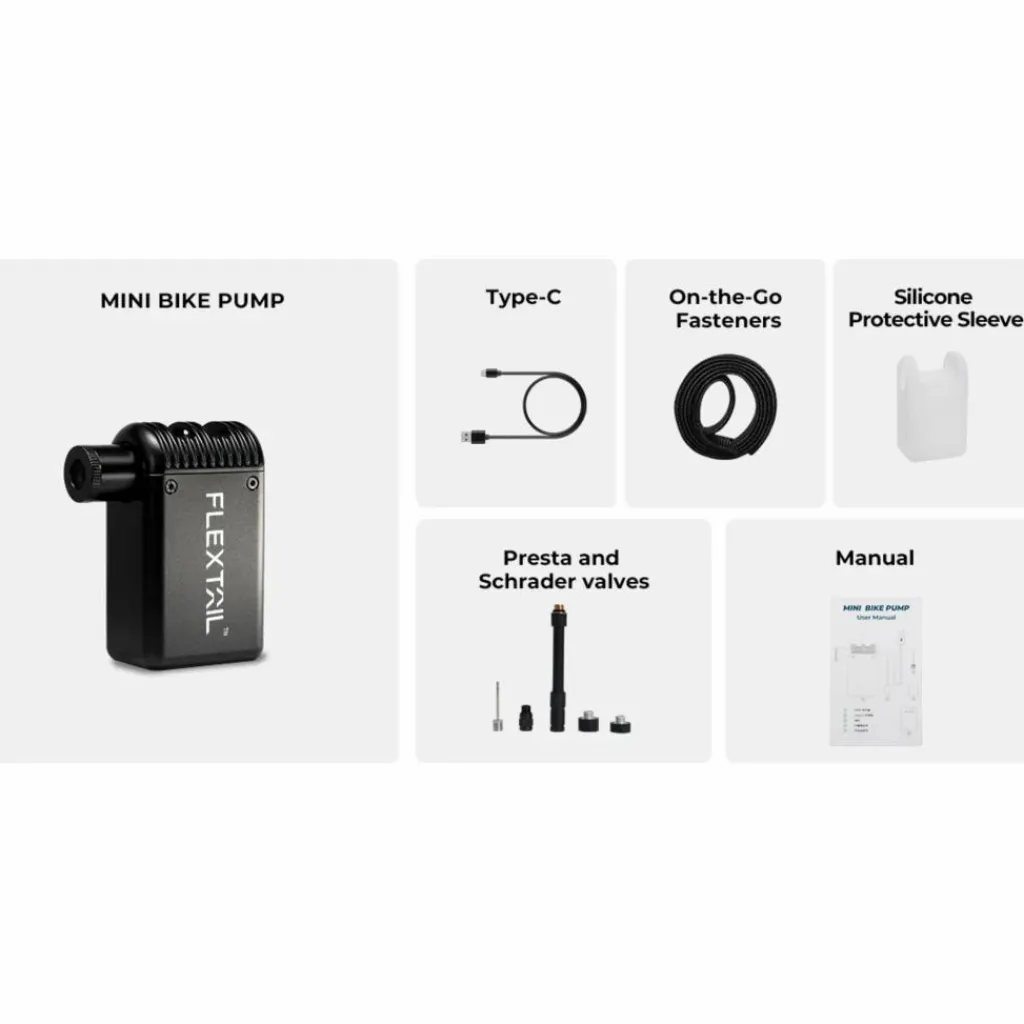 Tiny Bike Pump, Silikon-Schutzhülle, 4 Aufsätze, Schlauch, USB-C-Ladekabel, Packriemen (Klett), Bedienungsanleitung