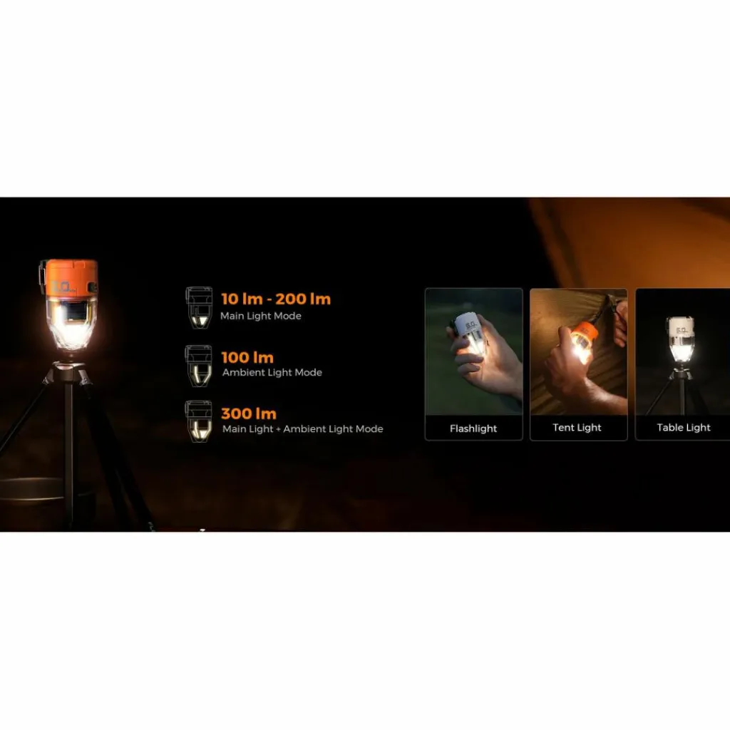 Die Pumpe verfügt über einen klaren, durchsichtigen und abnehmbaren Lampenschirm. Dank der integrierten Laternenfunktion kannst du dein Zelt oder deinen Tisch hervorragend ausleuchten. Die Lampe besitzt eine stufenlose Dimmfunktion von 10 bis 300 Lumen, sodass dir vom Leselicht bis zum gemütlichen Umgebungslicht immer die passende Lichtstärke zur Verfügung steht. Die Leuchtdauer variiert je nach Modus zwischen 4 Stunden bei 300 Lumen und bis zu 400 Stunden bei 10 Lumen.