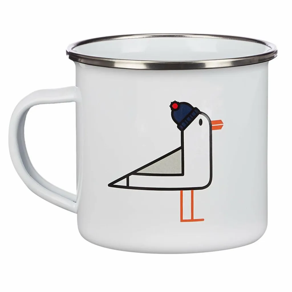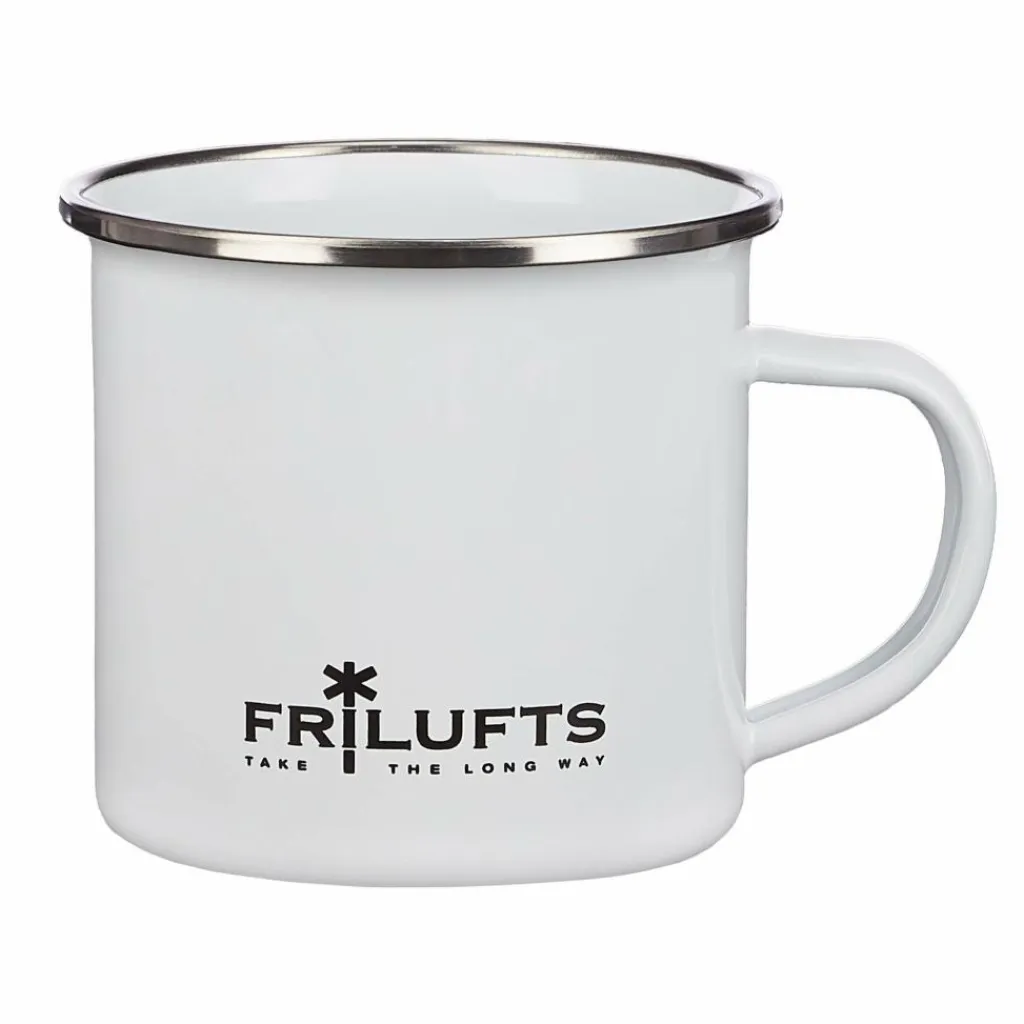 Lackierter Emaille-Becher mit Frilufts Print und Edelstahlrand. Gut geeignet für den morgendlichen Kaffee am Lagerfeuer. Der Becher fasst 350 ml und misst 8 x 9 cm (HxB).