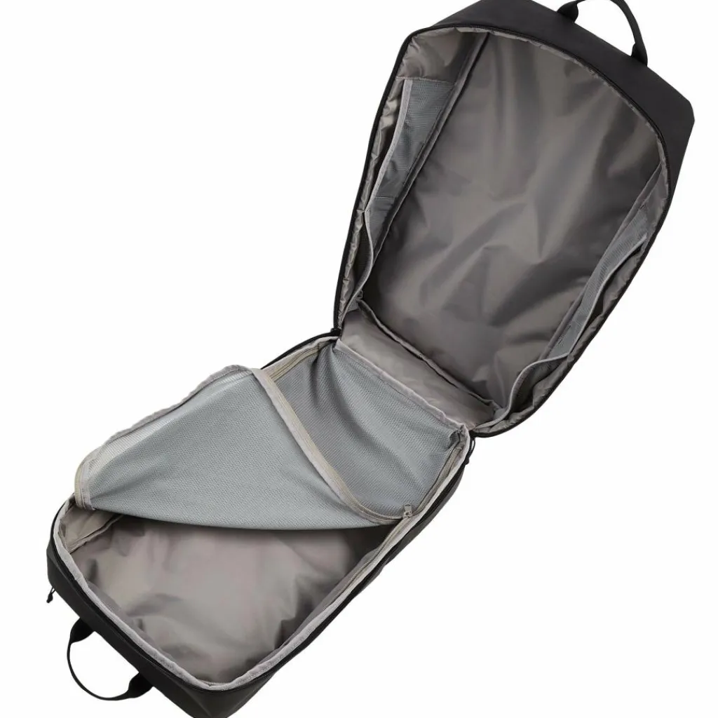 Der Duffle Organizer lässt sich komplett aufklappen wie ein Koffer. So hast du eine gute Übersicht über den Inhalt. Das Deckelfach ist mit einem Netz versehen, damit alles an seinem Platz bleibt, wenn du den Packbeutel zu- oder aufklappst. Außerdem befinden sich im Innern vier Netzfächer für Kleinteile. Die insgesamt drei Fächer auf der Front ermöglichen es dir, Wichtiges wie Ladekabel, Kopfhörer und Reiselektüre schnell zur Hand zu haben, ohne den Duffle Organizer aus der Tasche zu nehmen.