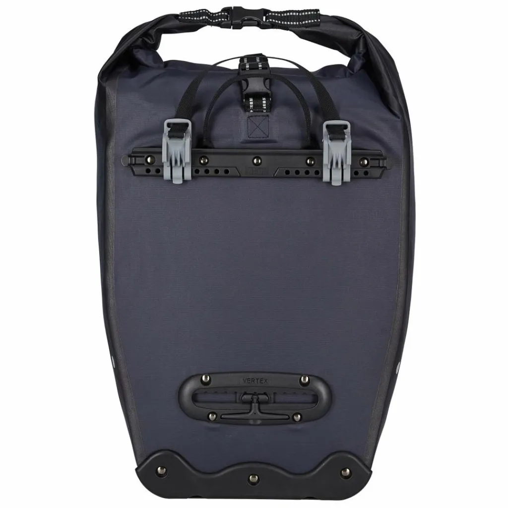 Das stabile Material ist ein 420D-Nylon, welches mit Polyurethan beschichtet ist; PVC kommt hier nicht zum Einsatz. Alle Nähte sind verschweißt, sodass du mit gerolltem Verschluss einen höchst wirksamen Schutz gegen Nässe und Staub hast. Kunststoff-Füße schonen das Material der Fahrradtasche beim Abstellen. Reflektierende Elemente direkt auf der Tasche als auch im Gurtzeug sorgen für Sichtbarkeit.