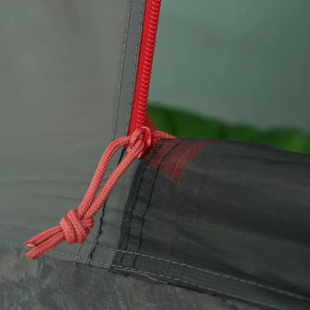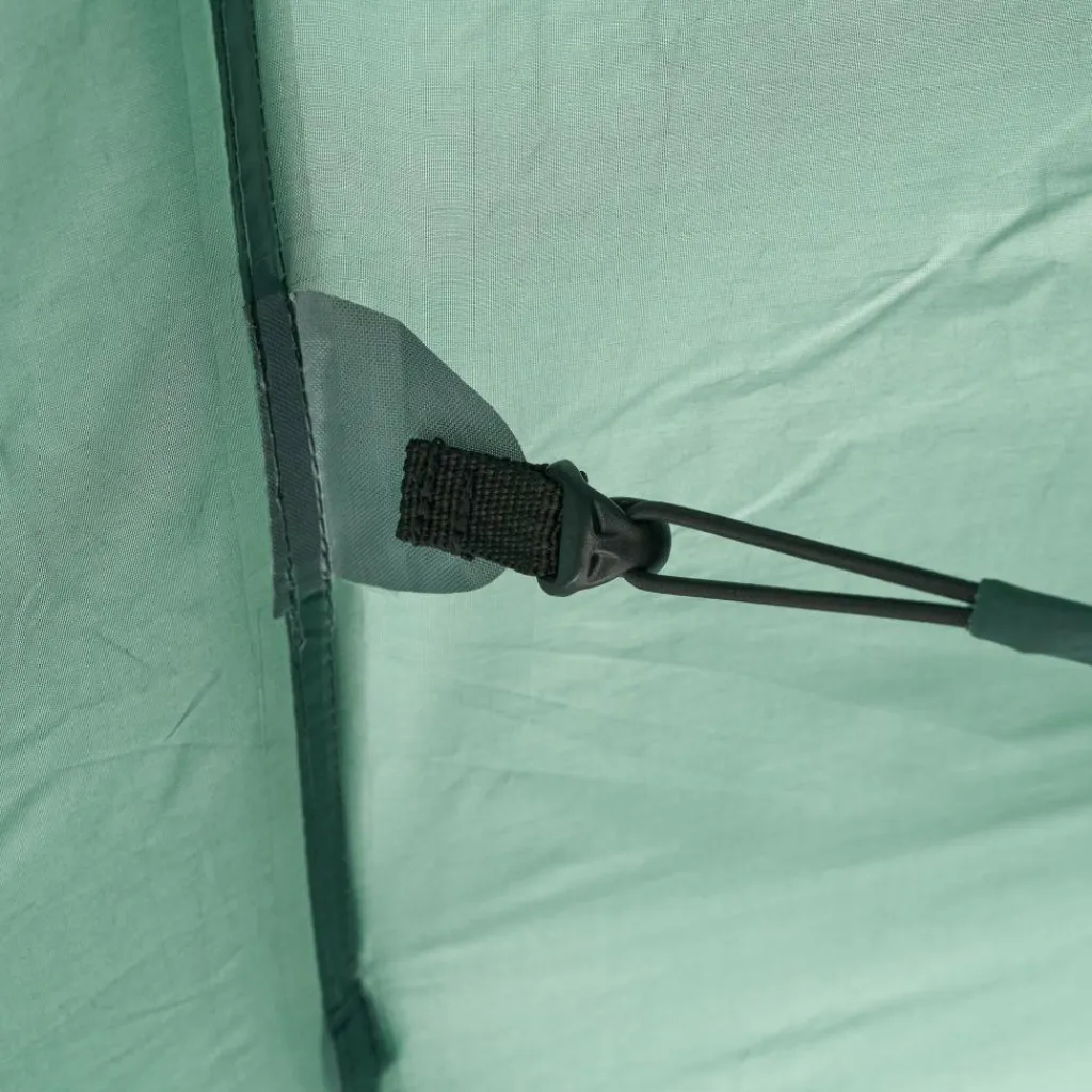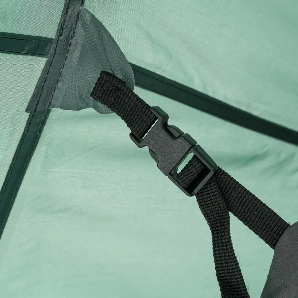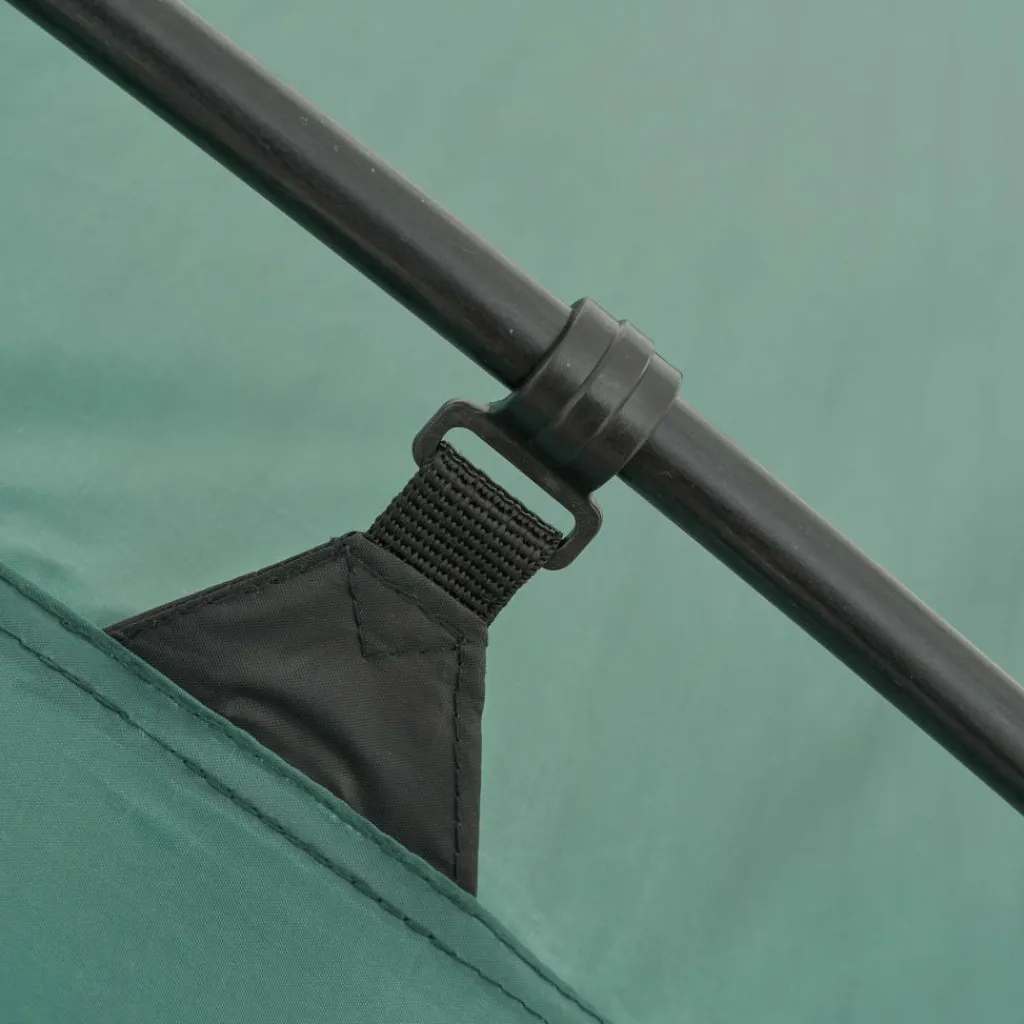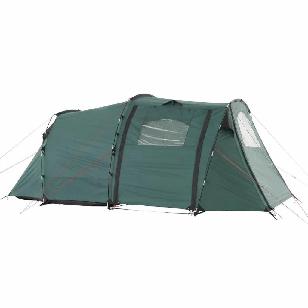 In der Apsis ist Platz für Ausrüstung oder einen kleinen Tisch mit Stühlen. Bei schönem Wetter lassen sich alle drei Eingänge aufrollen oder mit den im Lieferumfang enthaltenen Aufstellstangen aufstellen. Das Aufstellen sorgt nicht nur für besseres Klima und schönen Ausblick, sondern dient gleichzeitig als Sonnenschutz. Jede Tür verfügt über ein eigenes Fenster, das mit Stoff verschlossen werden kann.