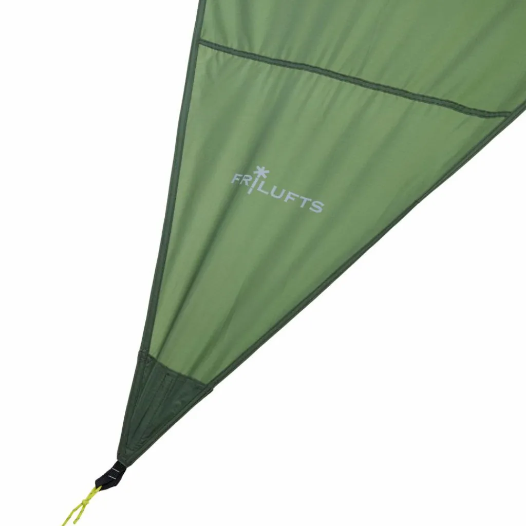 Dreieckiges Tarp aus Ripstop Polyester. Lässt sich durch insgesamt drei Abspannpunkten straff abspannen. Durch das kleine Packmaß nimmt es nicht viel Platz im Tourengepäck ein.