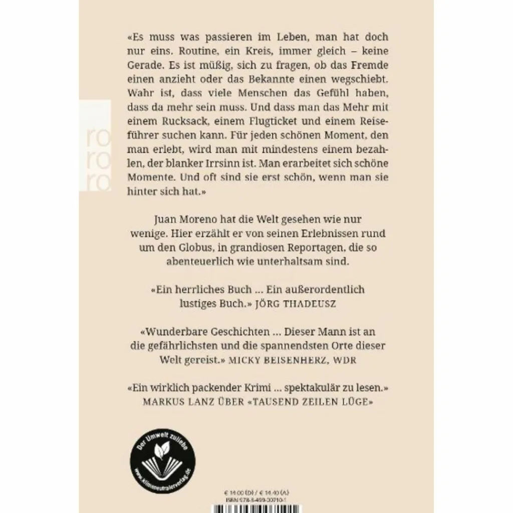 Als er eine Auszeit braucht, geht er ein Jahr lang auf Weltreise. Aber das Abenteuer wartet auf den, der es versteht, auch anderswo: ob zu Hause, bei den frommen Pilgern auf dem Jakobsweg oder in der Heimat Spanien. Dies alles erzählt Moreno in dem typischen Sound, der ihm seit Jahren eine große Leserschaft sichert: mit Witz und Tiefgang, stilistisch elegant und scharf beobachtet.