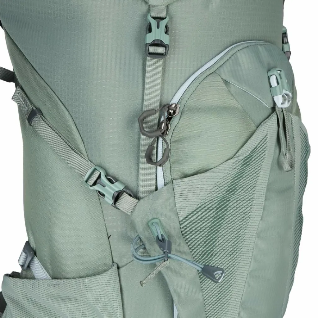 Über die u-förmige Frontöffnung hast du leichten Zugriff auf deine gesamte Ausrüstung. Im Deckel befindet sich eine Regenhülle für Regentage und in den geräumigen Außenfächern können neben Trinkflaschen auch sperrige Teile wie das Zeltgestänge verstaut werden. Besonders praktisch sind die großzügig geschnitten RV-Fächer auf dem Hüftgurt.