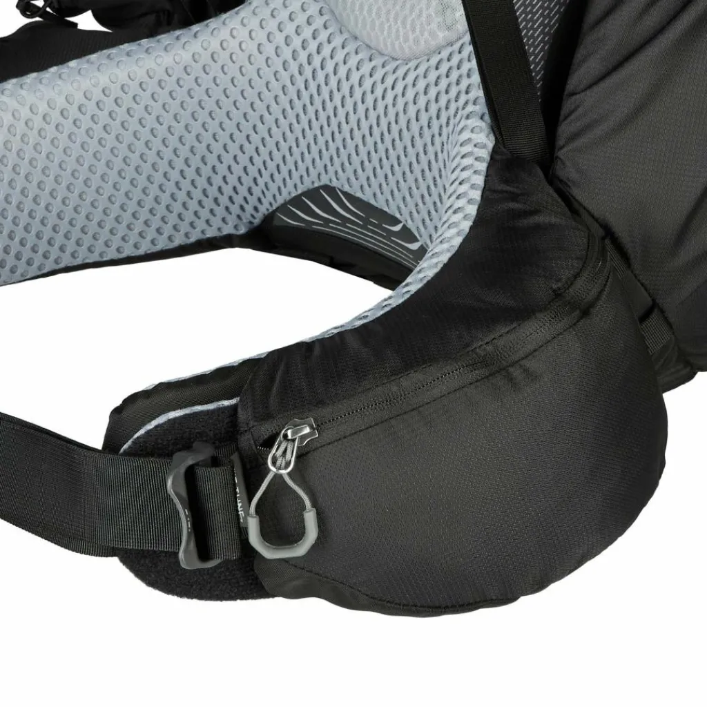 Auf den ersten Blick fällt das Steckfach auf dem linken Schultergurt auf. Darin kannst du entweder deine Sonnenbrille griffbereit verstauen oder ein GPS-Notrufgerät wie das Garmin InReach Mini 2 (optional erhältlich). Das Frontfach wurde mit 420D Nylon verstärkt, sodass du dir beim Ablegen des Trekkingrucksacks keine allzu großen Gedanken um Abrieb machen musst. Auch das seitliche Steckfach besteht nun aus robustem Nylon und wurde zudem vergrößert. So eignet es sich perfekt für sperrige und scharfkantigere Gegenstände wie Zeltgestänge oder Trekkingstöcke.