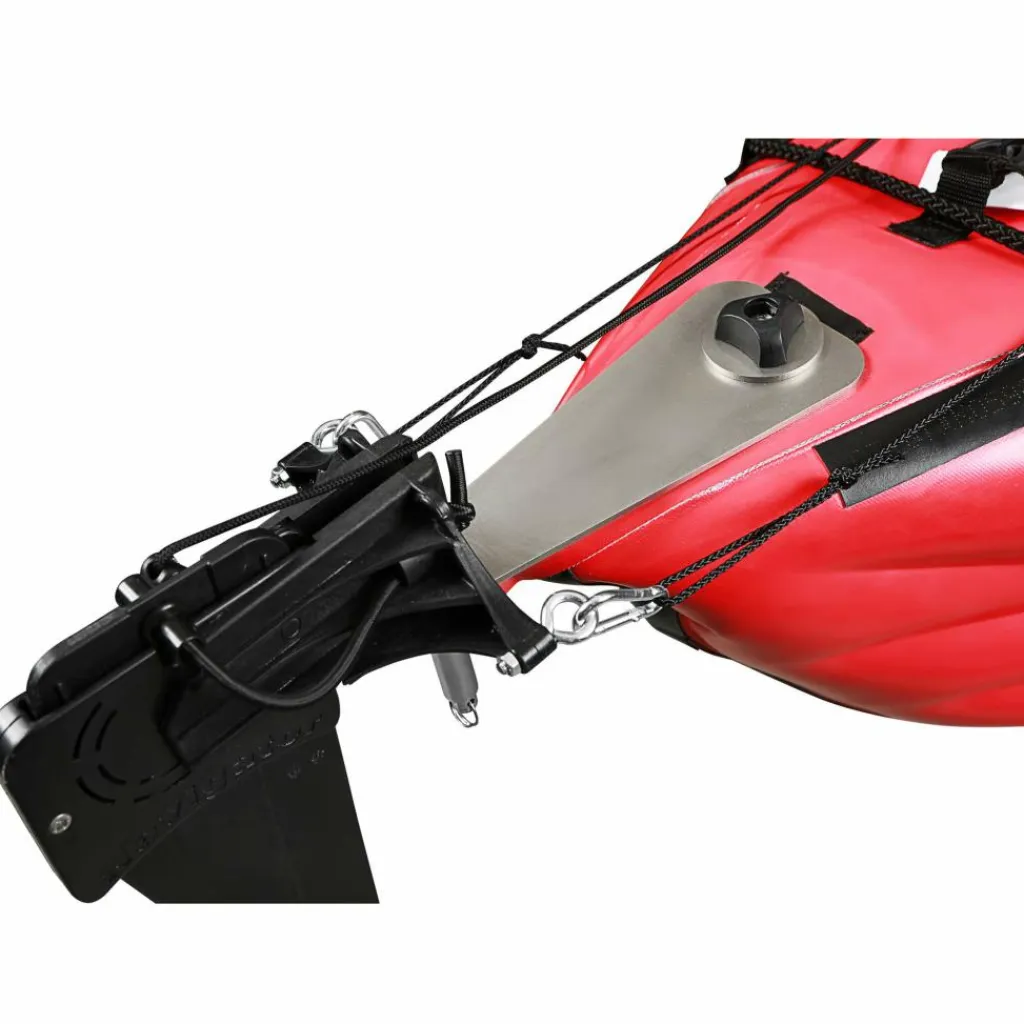 Das ca. 50 cm lange Steuerblatt wird am Heck mit Schrauben fixiert und kann in flachem Gewässer hochgeklappt werden. Die Steuerseile werden durch die entsprechenden Ösen und die Pedale am Boden gefädelt.