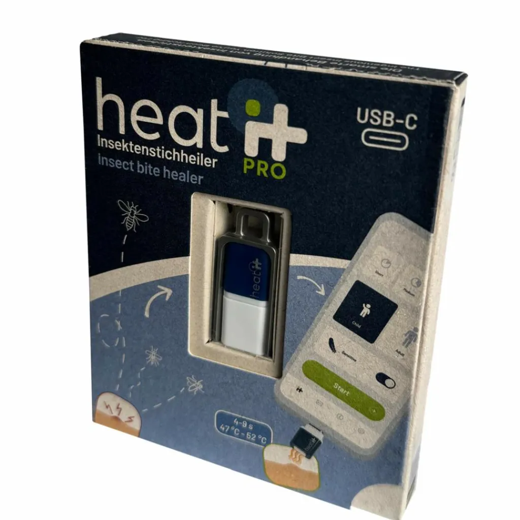 Der kleine und handliche Heat it Pro ist der ideale Begleiter im Alltag, auf Reisen oder im Erste-Hilfe-Set beim Sport. Um ihn immer dabeihaben zu können, ist die Pro-Version mit einem robusten Metallgehäuse ausgestattet, mit dem du den Stichheiler sicher am Schlüsselbund befestigen kannst. Zum Lösen ziehst du das Unterteil herunter und klappst den Stichheiler seitlich heraus. So bist du jederzeit gegen juckende Stiche gewappnet.
