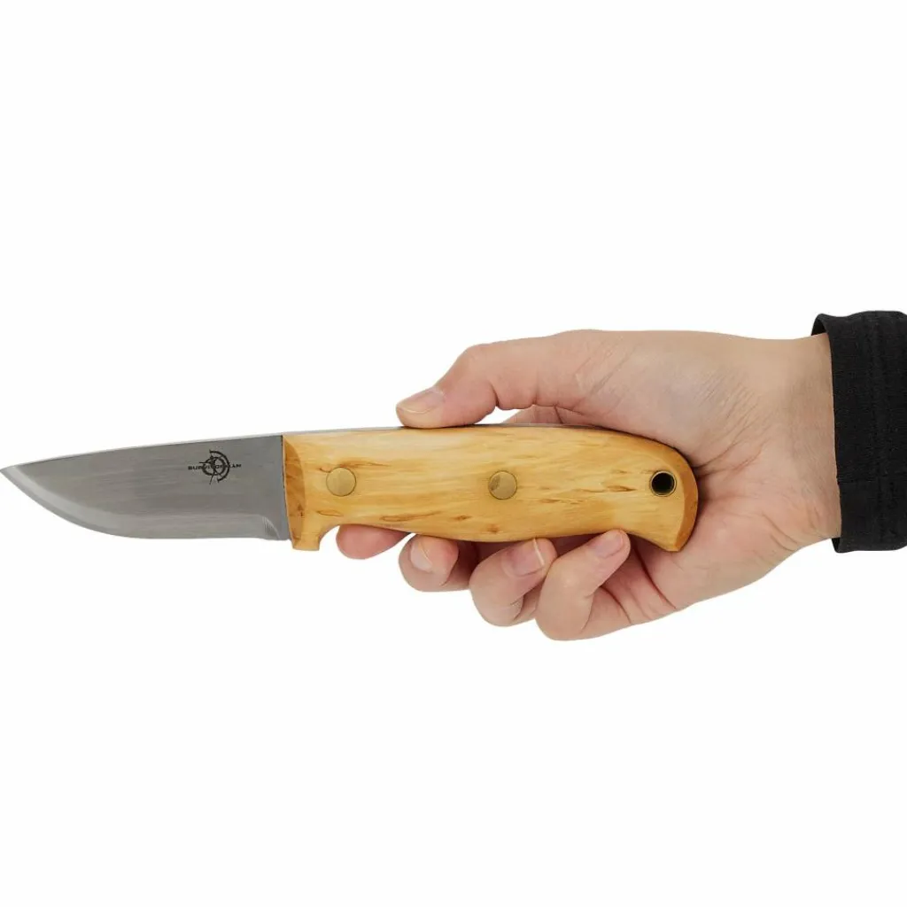 Der satinierte Griff aus Maserbirke macht jedes Messer zu einem Unikat, denn keine Maserung gleicht der anderen. Um diese natürliche Schönheit zu betonen, wird der Griff von Hand poliert und geölt. Die beiden Griffschalen werden sicher durch dicke Messingnieten und eine Rohrniete am Griffende fixiert. Die Rohrniete dient gleichzeitig als Fangriemenöse, durch die du eine Kordel ziehen kannst.