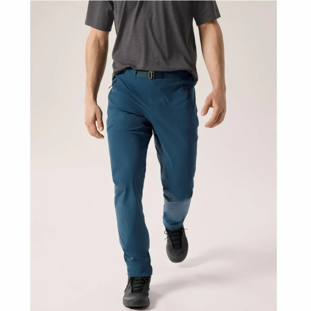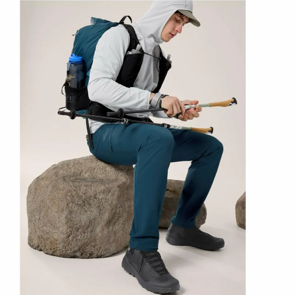 Eine dezente, aufgeräumte Ausstattung, die aufs Wesentliche reduziert ist, unterstützt das geringe Gewicht der Hose und sorgt für Komfort. So macht sich der integrierte Gürtel selbst unter einem Klettergurt oder Rucksackhüftgurt nicht bemerkbar. Die Beinabschlüsse lassen sich dank Kordelzug zusammenziehen, sodass du den nächsten Tritt immer im Blick hast. Drei Reißverschlusstaschen bieten sicheren Stauraum für Schlüssel, Riegel und Co.