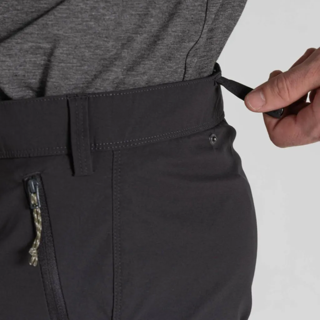 Die leichte Hose ist mit einigen hilfreichen Kleinigkeiten ausgestattet. Der einstellbare Hosenbund ist mit einem feuchtigkeitsleitenden Band versehen, welches dir bei heißen Temperaturen zur Seite steht. Auch die Beinabschlüsse lassen sich regulieren, um Insekten weniger Möglichkeiten zu bieten. Zusätzlich befindet sich im Inneren ein Abriebschutz, der eine schnelle Abnutzung durch deine Wanderstiefel verhindert. Stauraum wird dir in insgesamt vier Taschen geboten. Eine von ihnen lässt sich mithilfe eines kleinen Karabinerhakens schließen und verfügt zudem über eine RFID-Tasche, die Kreditkarten vor dem Auslesen schützt.