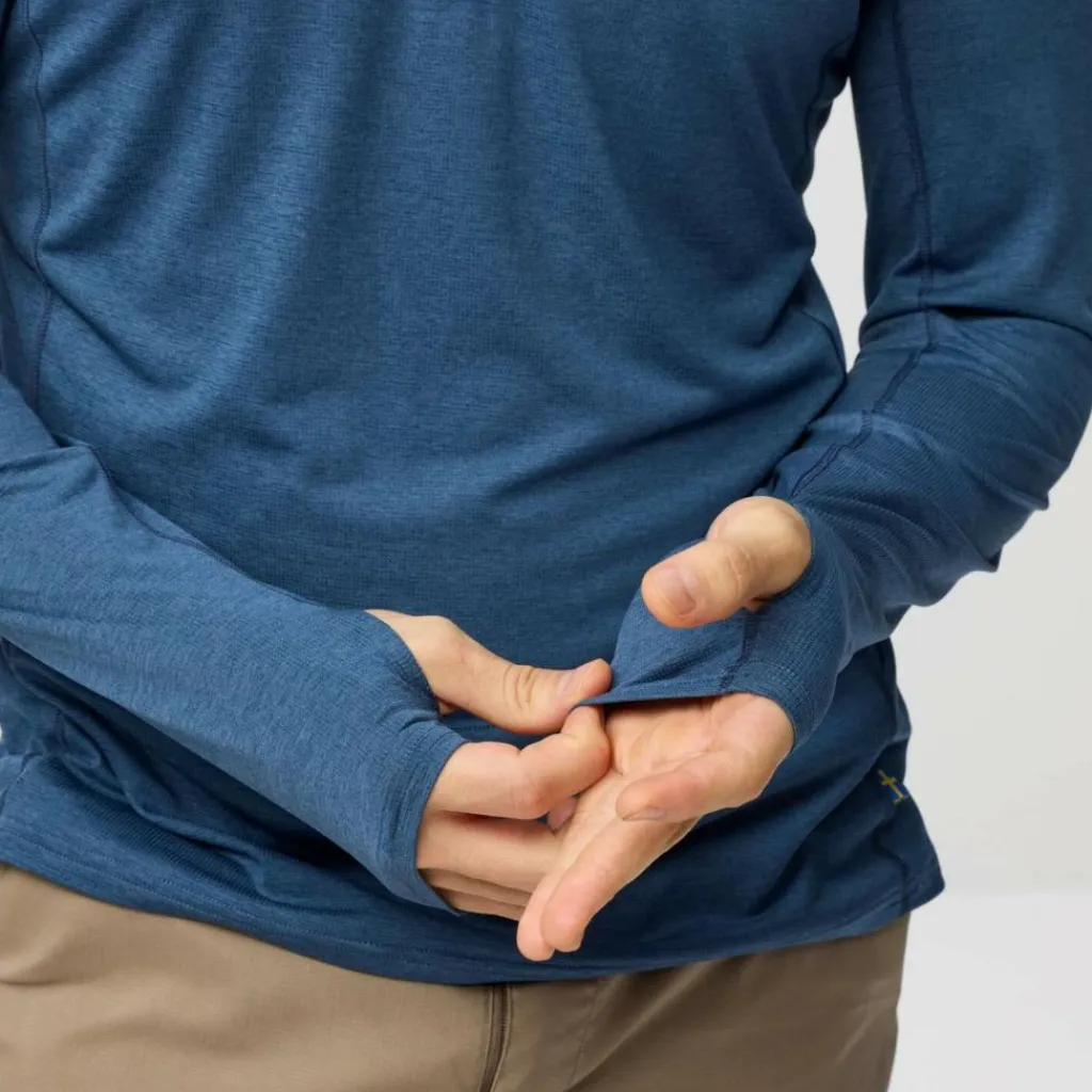 Das Langarmshirt funktioniert erstklassig beim warmem Wetter; wanderst du im Sommer, sorgt es für schnelles Trocknen. Das luftige Gewebe leitet zudem Feuchtigkeit rasch von der Haut weg und hält diese trocken. Außerdem schirmt das Abisko Day Hike einen großen Teil deiner Haut vor der Sonne ab. Mit den Daumenlöchern sind auch die Handrücken abgedeckt. Trägst du das Abisko Day Hike im Lagensystem, vereinfachen die Daumen-Öffnungen an den Ärmelenden auch das An- und Ausziehen darüber liegender Lagen. Ein solides Funktionsshirt für all deine Outdoor-Abenteuer!