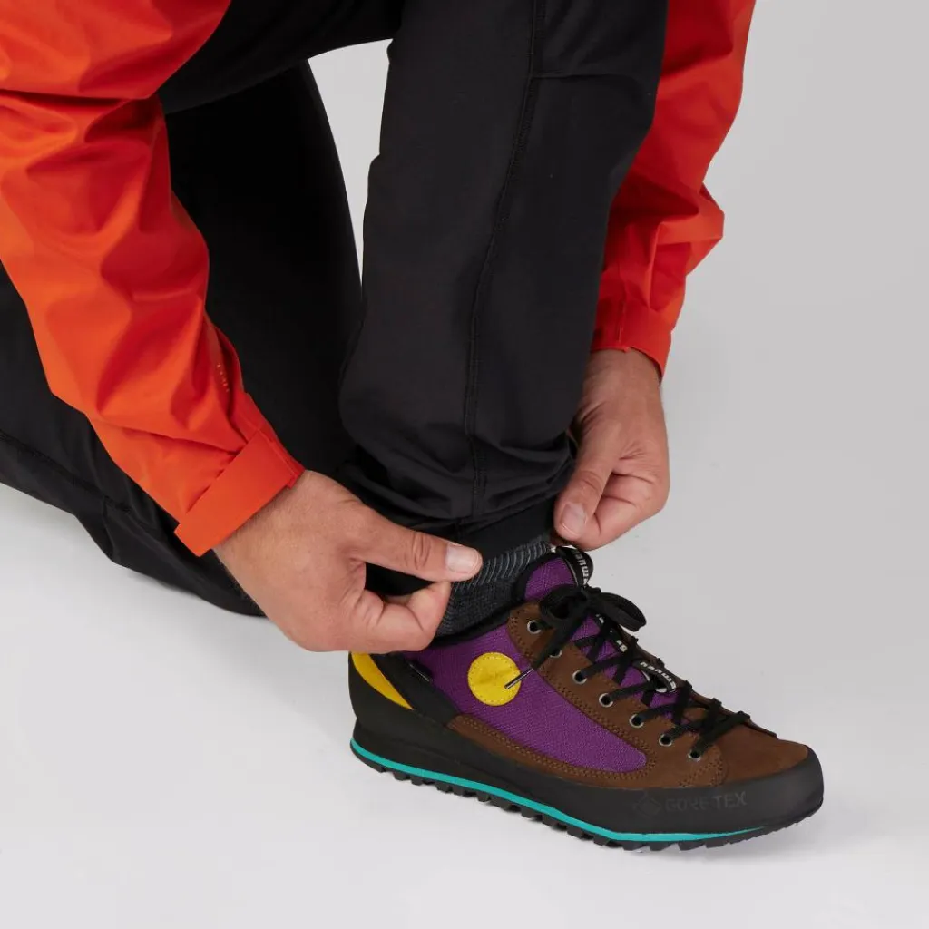 Der umlaufende Geröllschutzrand bietet dem darunter liegenden Leder und Cordura zusätzlichen Schutz, wenn du dich in sehr felsigem Gelände bewegst und im Alltag verleiht er dem Schuh einen wunderbar technischen Look! Die verarbeitete Gore-Tex Membran sorgt auch bei anhaltendem Regen zuverlässig für trockene Füße.