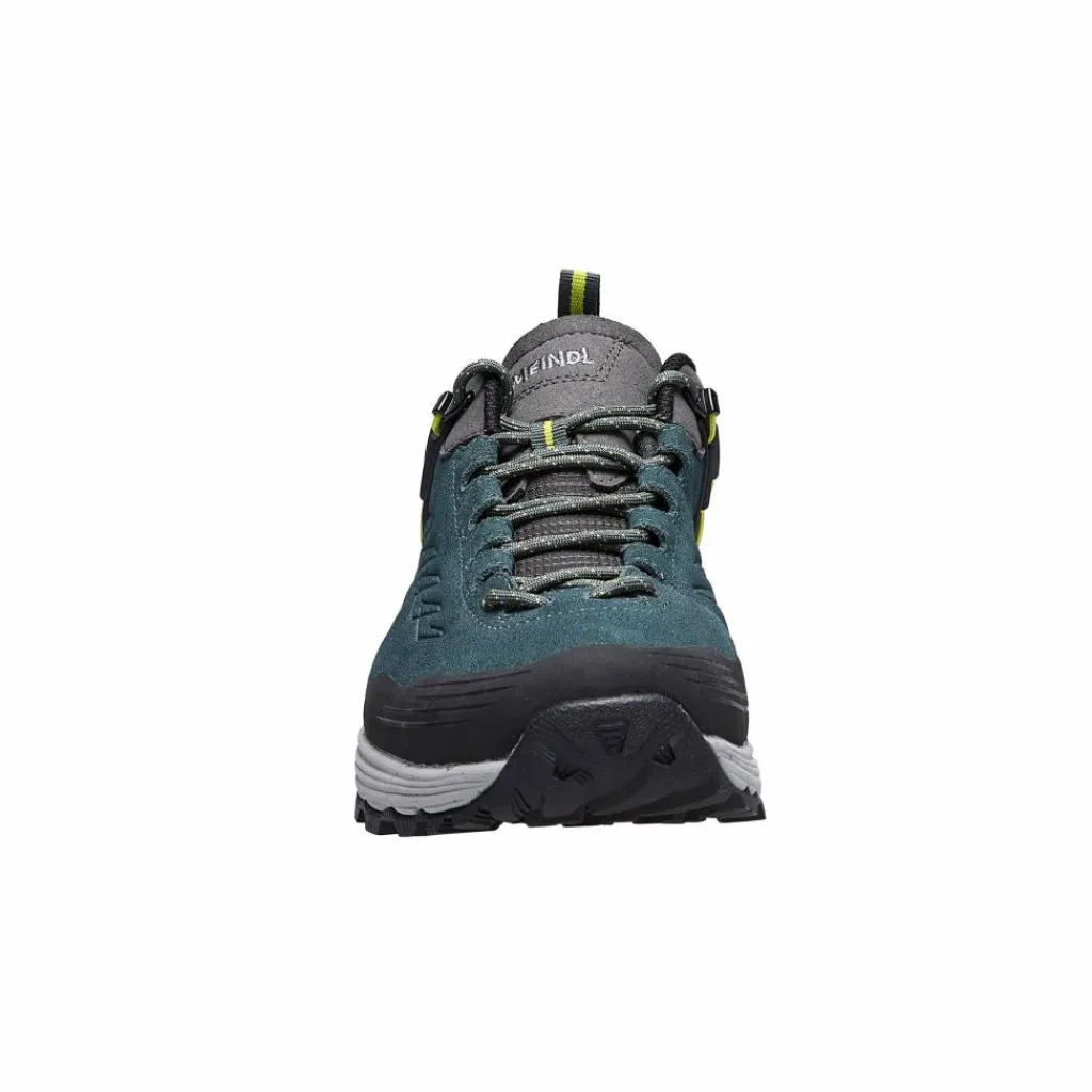 Beim Obermaterial kommen Velours- und Nubukleder zum Einsatz, das an den Zehen und an der Ferse zusätzlich durch einen schützenden Gummirand verstärkt wird. Innen ist der leichte Schnürer mit Textilfutter ausgestattet, eine Gore-Tex Membran sorgt dafür, dass die Füße trocken bleiben.