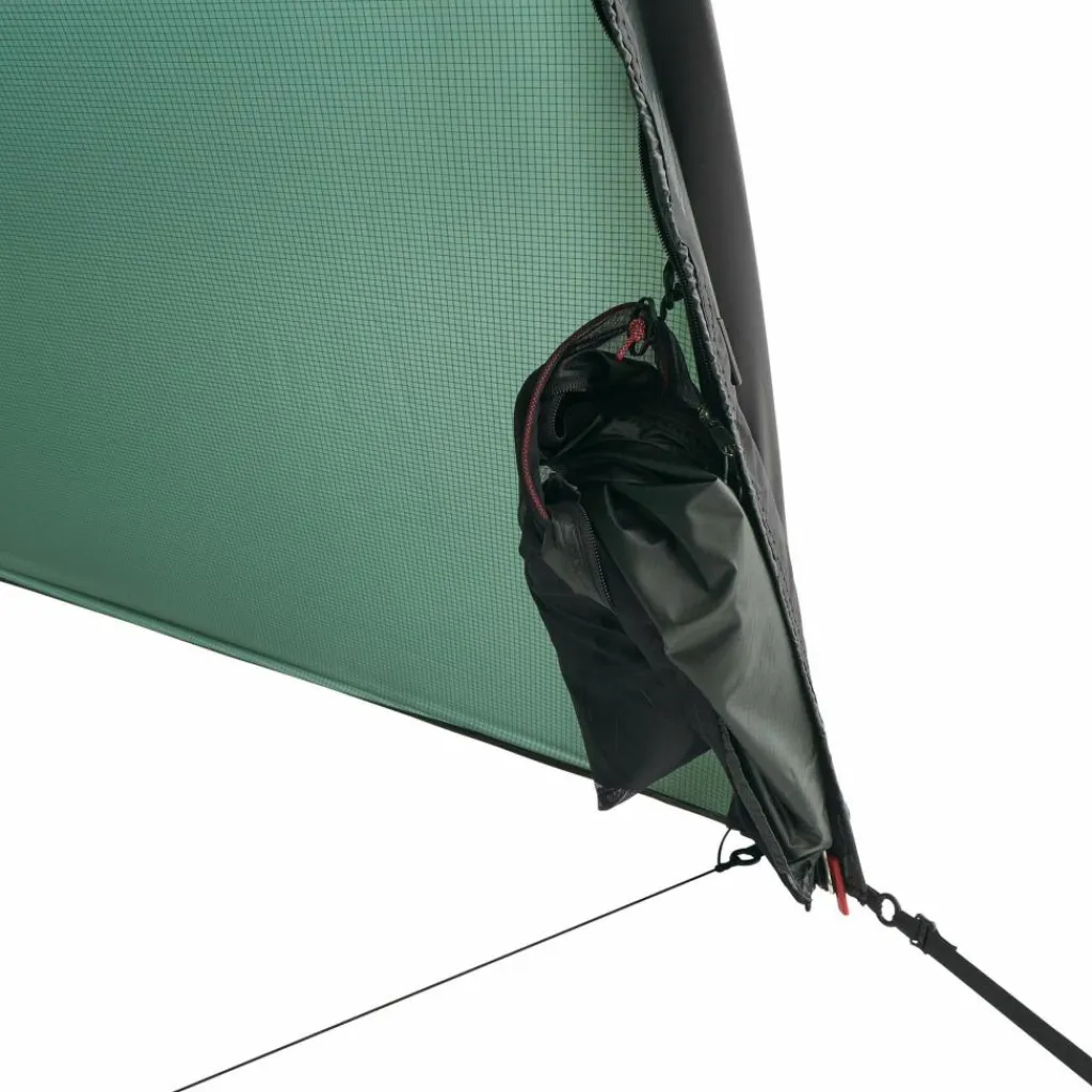 Der seitliche Apsiden-Eingang lässt sich separat mit Moskito-Gaze verschließen. Zudem ist er abgerundet, sodass sich kein Regenwasser auf der Naht sammeln kann. In der großen Apsis lässt sich bei schlechtem Wetter gut sitzen und essen. Die Ausrüstung kann wahlweise in der kleinen oder großen Apsis untergebracht werden. So ist immer genügend Platz und nichts steht im Weg.