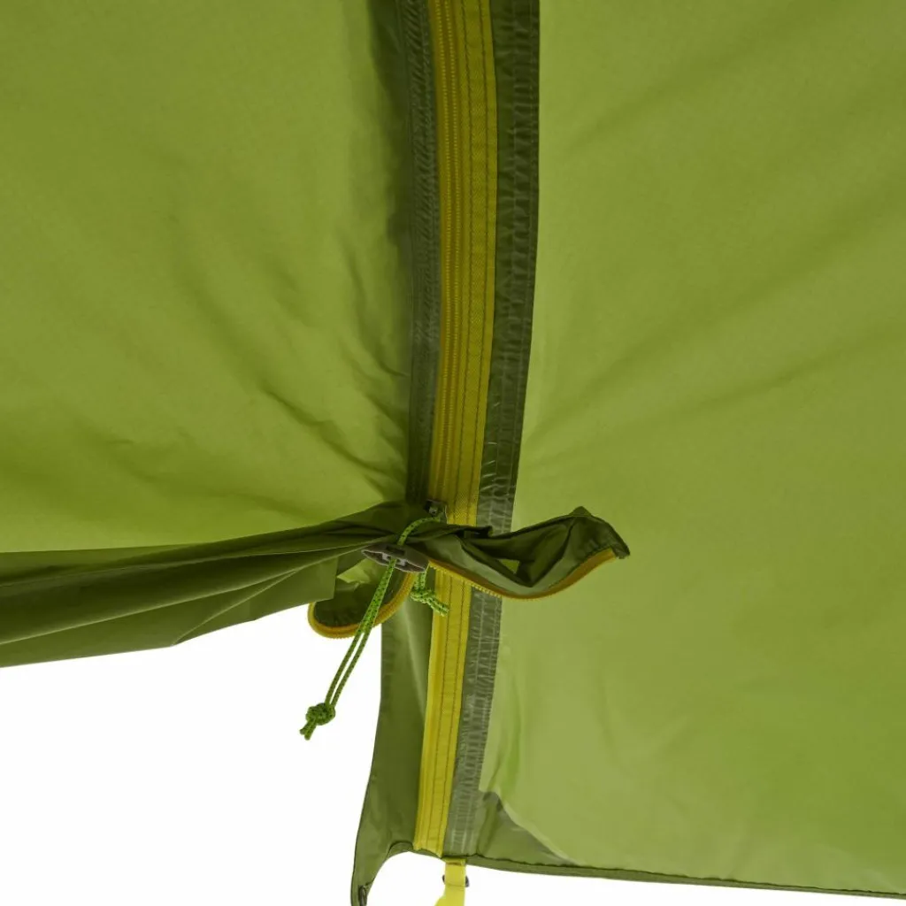 Die zweite Lüftungsoption kann über den Eingang vorgenommen werden. Die „Zip-Vents“ können so weit wie gewünscht geöffnet werden und so für einen schwachen oder starken Luftstrom sorgen. Das lose Türende fixierst du dabei entweder am Druckknopf oder am Tanka-Verschluss. Dieser sorgt dafür, dass das herunterhängende Ende nicht auf dem Boden liegt und schmutzig wird. Die Tür kann so bequem auf- und zugezogen werden.
