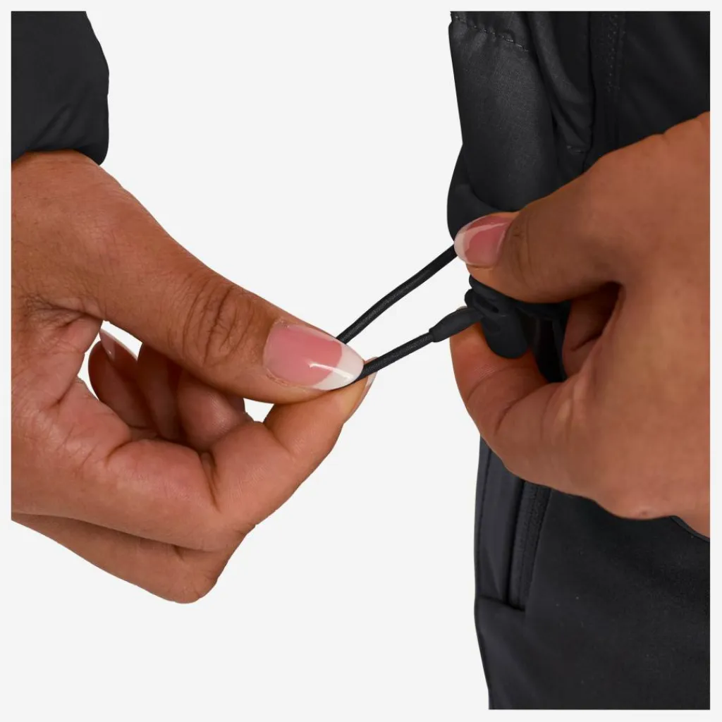 Den Saum kannst du über einen Schnürzug deinen Bedürfnissen anpassen. Der durchgehende Reißverschluss ist unterlegt, sodass es Wind und Kälte auch hier schwer haben. Für schnell erreichbare Habseligkeiten ist die Daunenjacke mit zwei seitlichen RV-Taschen ausgestattet. Sie lässt sich zudem sehr leicht verstauen.