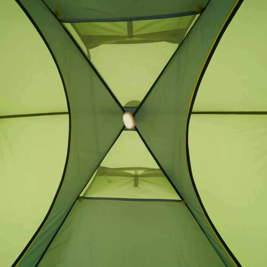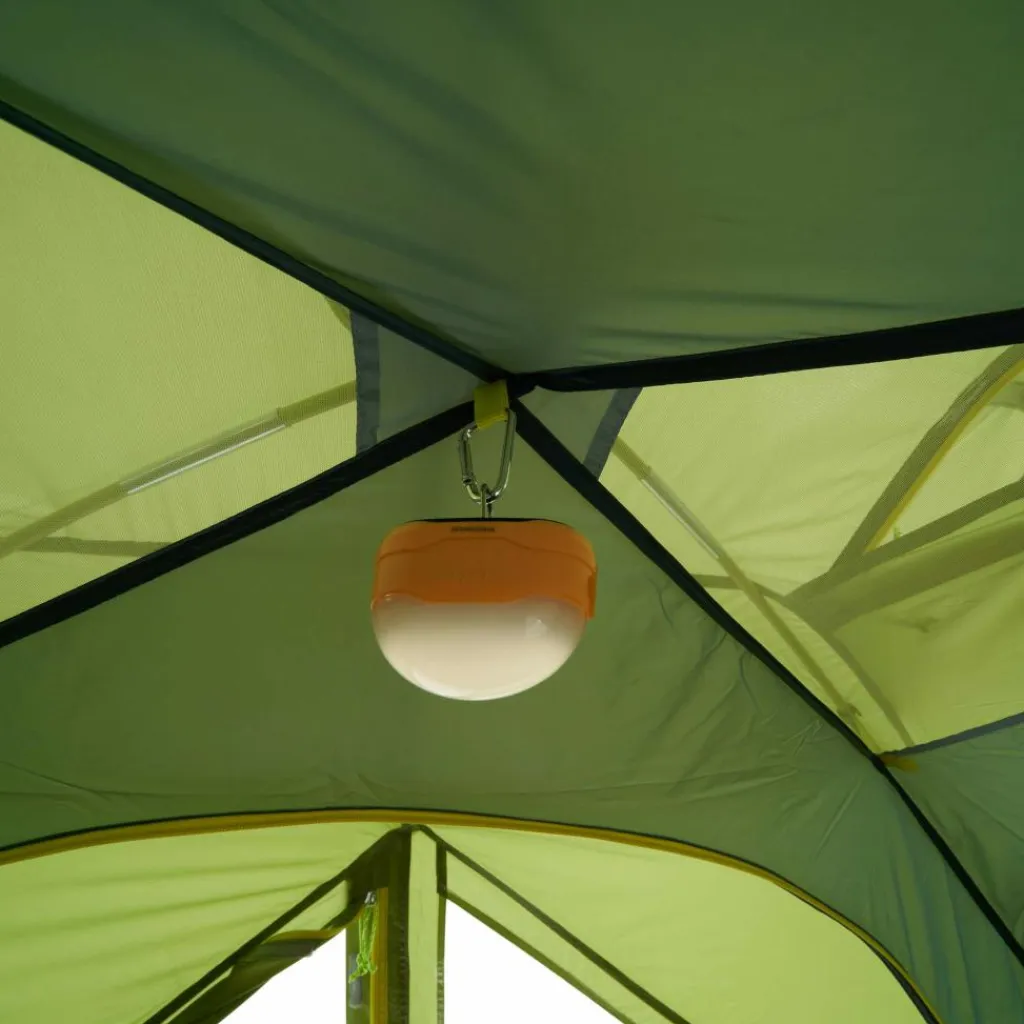 Belüftet wird das Kuppelzelt über die beiden aufstellbaren Hochlüfter, die mit einer Regenschutzleiste versehen sind. So kann der Wind die Regentropfen nicht durch den Lüfter ins Zelt drücken. Ist der Abend besonders mild oder sehr warm, kannst du das Außenzelt auch weglassen und nur das Innenzelt aufstellen. Die großflächigen Meshflächen in den Eingangstüren können dabei für mehr Privatsphäre abgedeckt werden.