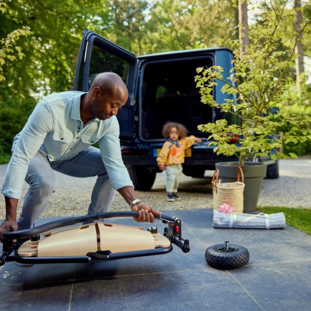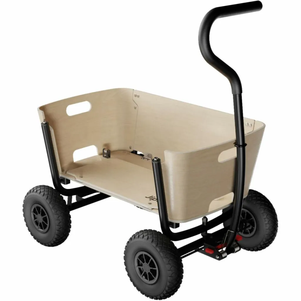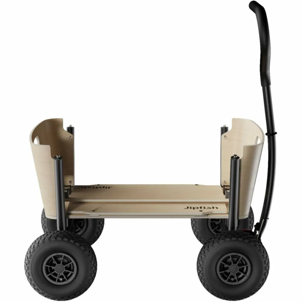 Dank seines kompakten Maßes passt der Jipfish auch in kleine Kofferräume und eignet sich dadurch ideal für spontane Familienausflüge. Der Aufbau ist zudem kinderleicht: Einfach den Wagen hochklappen, die Seitenwände aufrichten und der Bollerwagen ist bereit fürs Abenteuer. Wurden die Reifen abgenommen, lassen sich auch diese mit nur wenigen Handgriffen und ohne Werkzeug befestigen.