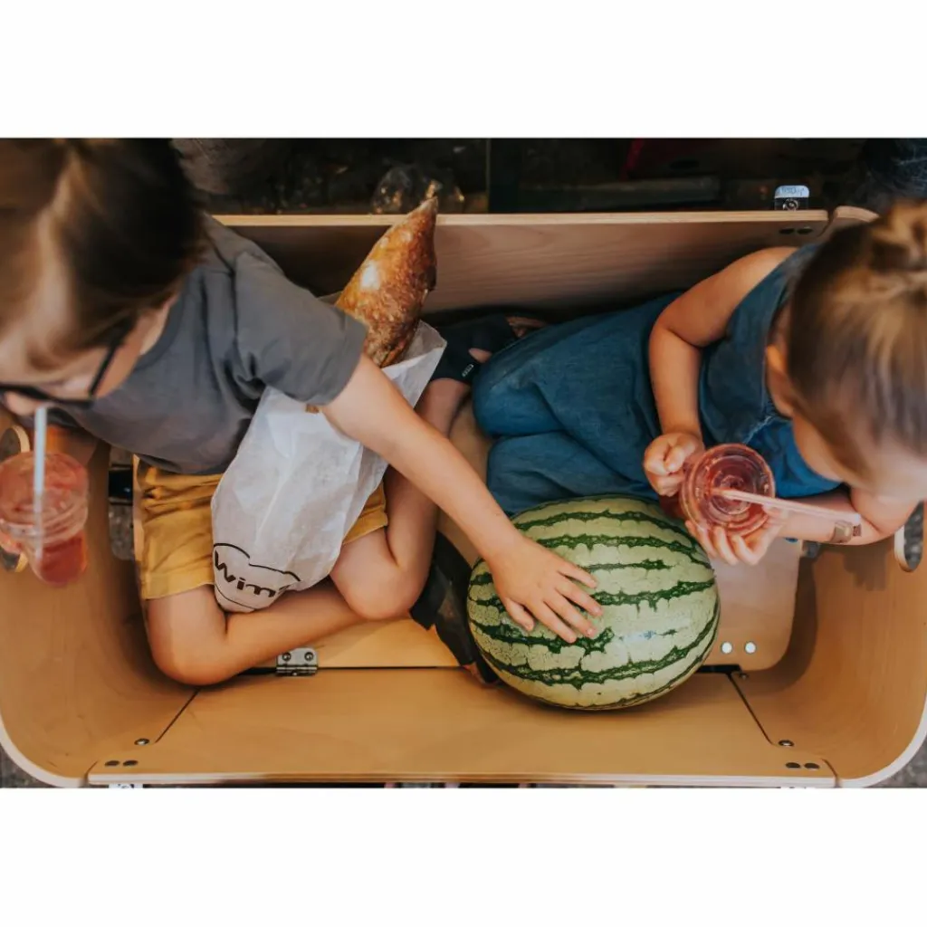 Apropos Möbel: Wird nur eine Seitenwand des Bollerwagens heruntergeklappt, verwandelt sich der Jipfish im Handumdrehen in eine Holzbank. Die optional erhältlichen Jipfish Sitz- und Rückenkissen (siehe Zubehör) sorgen dabei für zusätzlichen Komfort.