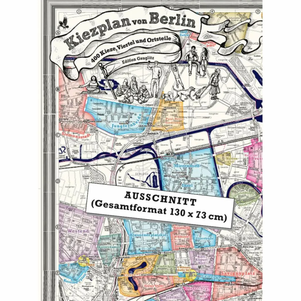 Die Kartographie und Planillustration spielt auf die alter Landkarten an. – Kartenformat: 130 x 73 cm Gefaltet geliefert: 33 x 24 cm Auch als Wandplan geeignet. – Planaufteilung: – Hauptkarte (S-Bahnring und Umgebung) Maßstab 1:17777, – Übersichtskarte (ganze Stadt) Maßstab 1:117500, – Ortsteilkarte, – Kiezverzeichnis (mit Angabe von Ortsteil, Bezirk und Altbezirk zu jedem Kiez), – Erklärungstext zum Plan und zum Begriff „Kiez“, – Illustrierter Titel.