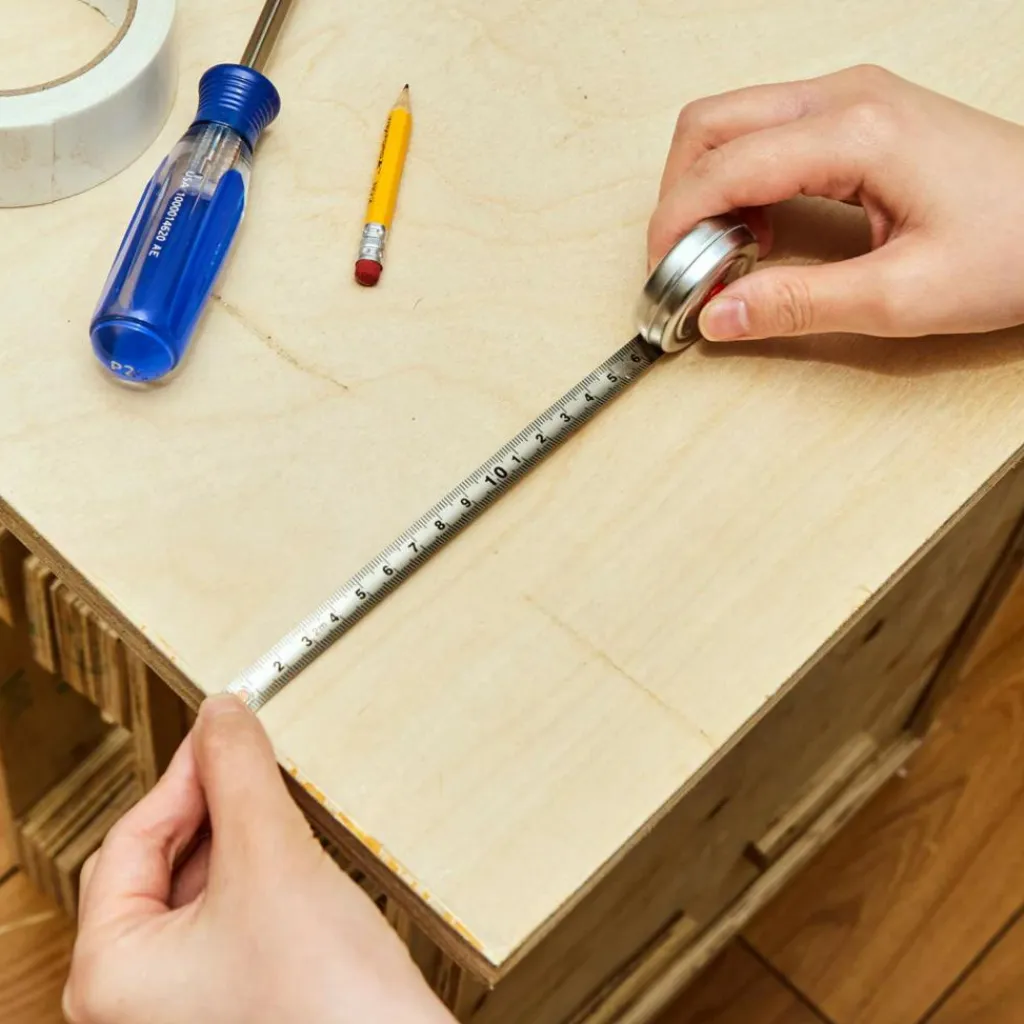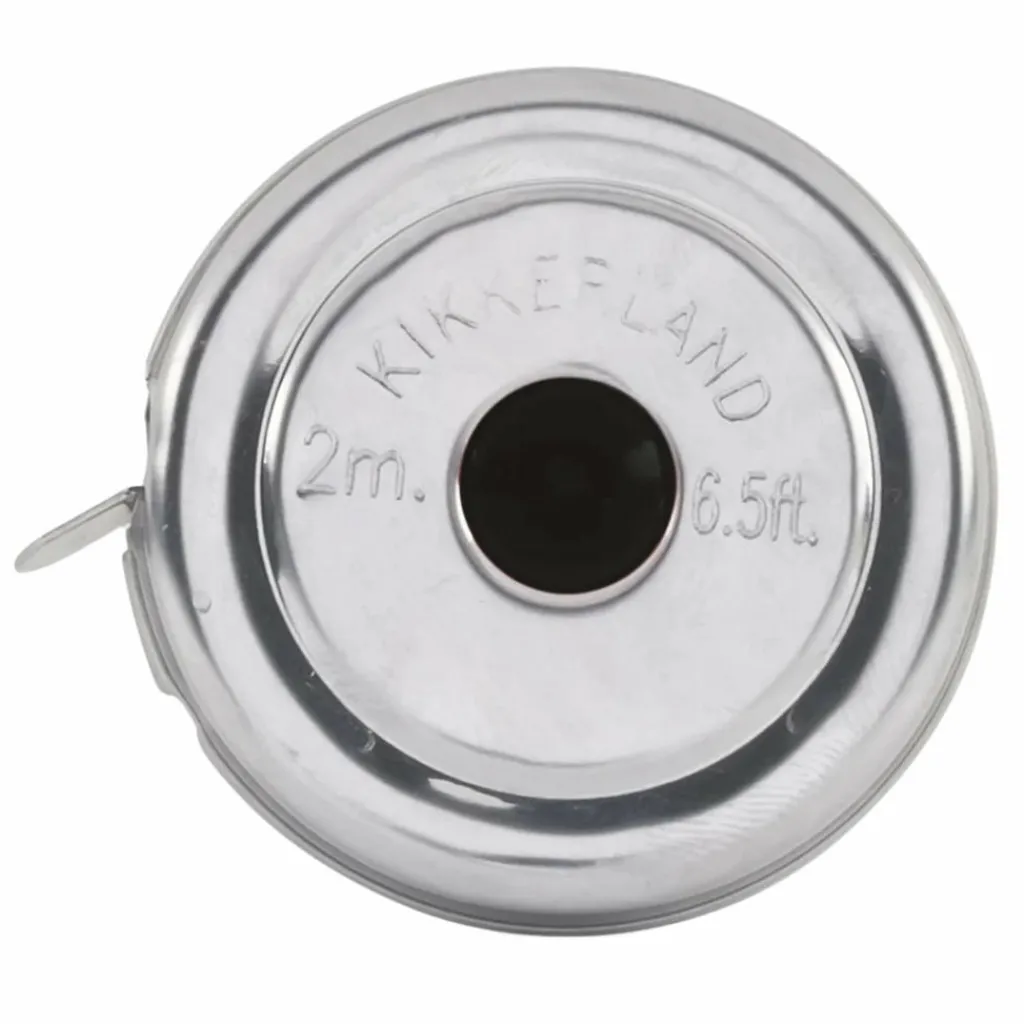 Elegantes Mini-Maßband aus rostfreiem Stahl mit einer Länge von 2 Metern und versenkbarem Griff. Stecke es in dein Nähset, Federmäppchen oder deine Handtasche. Ziehe es zum Lösen an der Lasche, und es zieht sich automatisch zurück, wenn du es loslässt.
