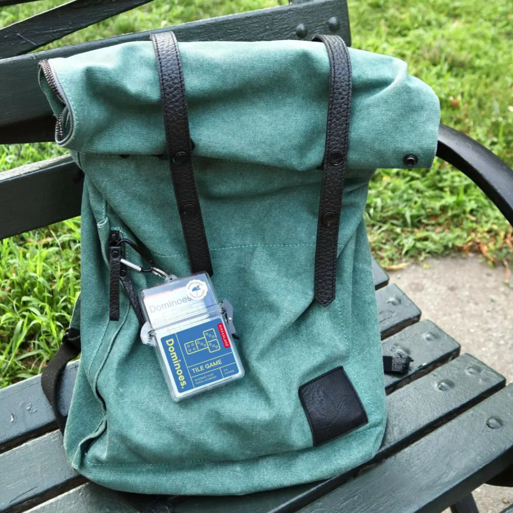 Domino für unterwegs: Ob vorm Zelt oder in der Bahn, mit den Dominoes ist immer eine Partie möglich. Praktisch: Alle Utensilien fürs Spiel kommen in einer wasserdichten Box mit Karabiner.